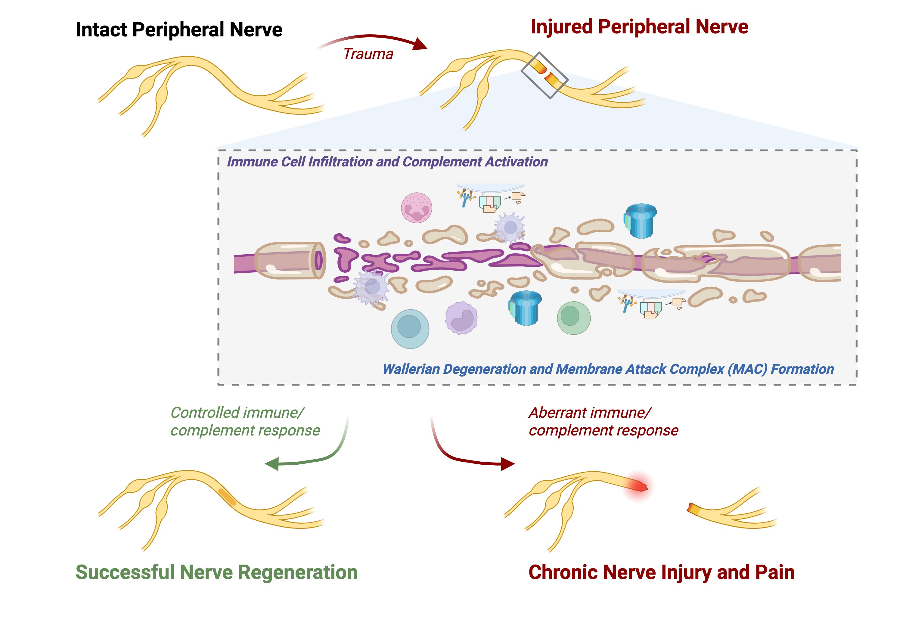 | Mast Cells | Mast cells create complement proteins C3 and C5 and contain receptors on their surface which allow for complement proteins to activate them. Mast cells release pro-inflammatory cytokines and serine proteases at peripheral nerve injury sites. Secretion and activation of complement proteins is up-regulated by cytokines and serine proteases, respectively. | Mast cells release cytokines, including (but not limited to) TNF-α. In turn, cytokines may stimulate mast cells to release complement proteins, such as C5, which may help create MACs needed for Wallerian degeneration. Hypothesized based on general immunology. |
