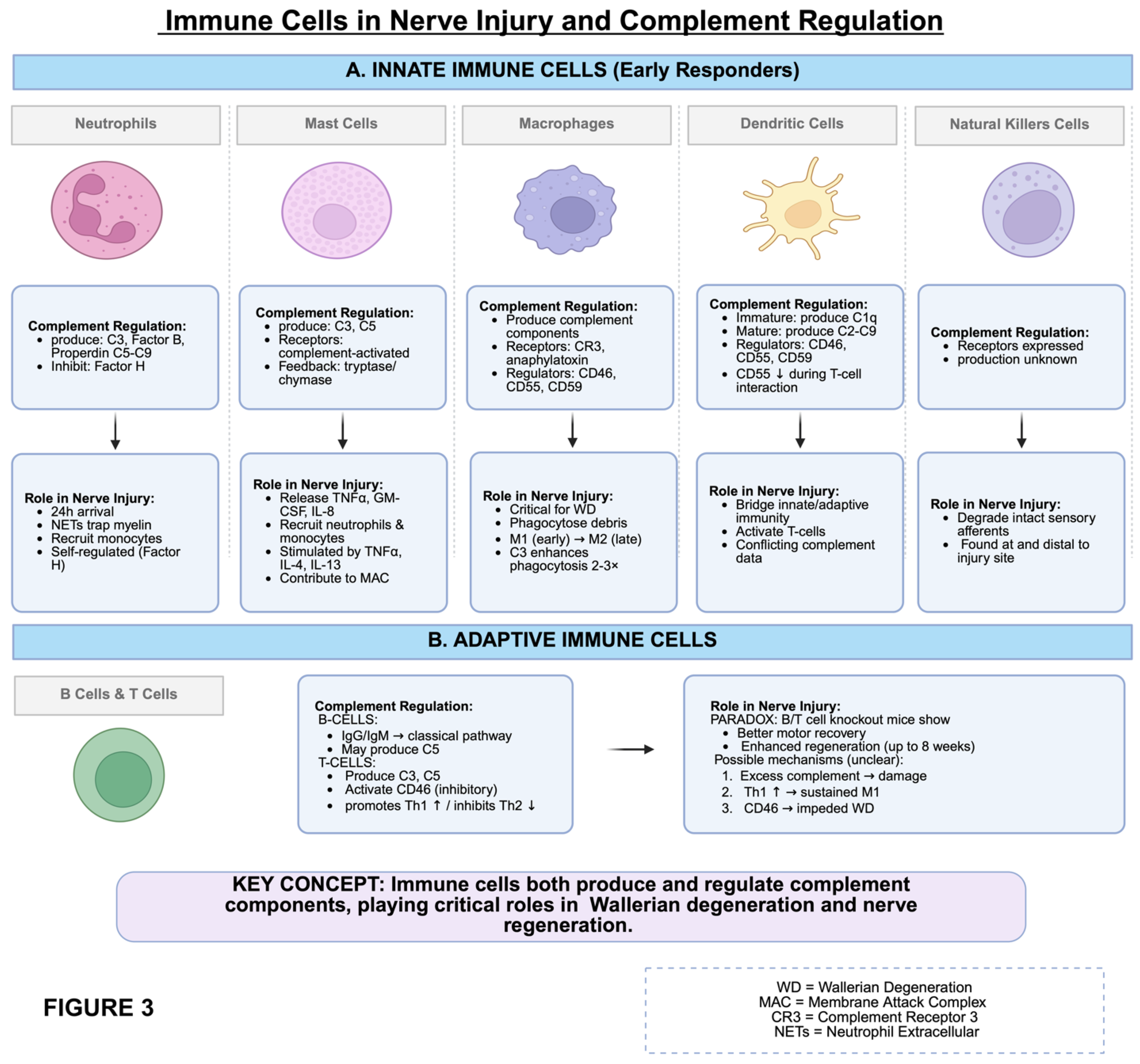 | Neutrophils | Neutrophils serve as regulators of the complement system. Factor C3, located on neutrophil membranes, down-regulates the complement system, whereas properdin, produced by neutrophils, prolongs the half-life of C3 convertase, stabilizing the complement system. Upon arrival at the PNI site, neutrophils aid in Wallerian degeneration through the phagocytic clearance of myelin debris and formation of neutrophil extracellular traps (NETs). | Neutrophils and the complement system have parallel roles in Wallerian degeneration. Neutrophils and the complement system’s parallel roles have been shown in peripheral nerve injury models; however, no direct mechanistic interaction between the two has been evidenced in these models. |