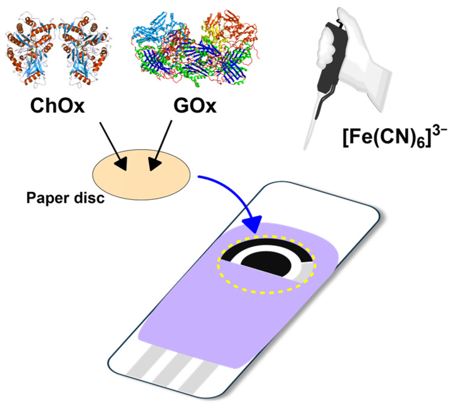 - Prakobkij, A.; Sukapanon, S.; Chunta, S.; Jarujamrus, P. Mickey Mouse-Shaped Laminated Paper-Based Analytical Device in Simultaneous Total Cholesterol and Glucose Determination in Whole Blood. Anal. Chim. Acta 2023, 1263, 341303. [Google Scholar] [CrossRef]