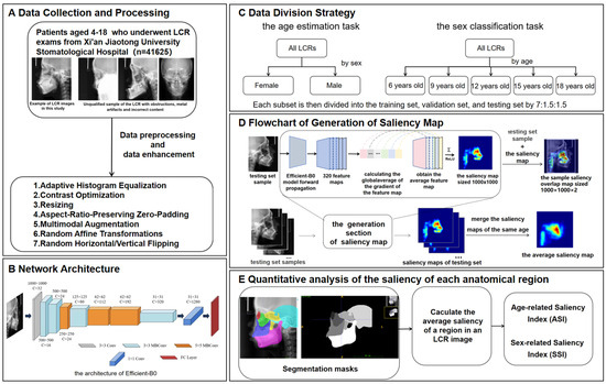Overview of the methodology of this study. (A) Data collection and processing. (B) Network architecture. (C) Data division strategy. (D) Process of generating a saliency map. (E) Quantitative analysis of the saliency of each anatomical region. The saliency map represents the contribution of each region in the X-ray cephalic localization lateral image to the final age estimation result. Since it is generated on the basis of the trained EfficientNet-B0, the saliency map contains feature information for each age group. Each testing set sample is concatenated with its corresponding saliency map to generate a sample saliency overlap map of size , where 2 indicates the channel number. All the saliency maps of the same age are merged into the average saliency map corresponding to that age. The intensity of the red hue in the saliency map corresponds directly to the degree of age-related predictive importance within each anatomical region.