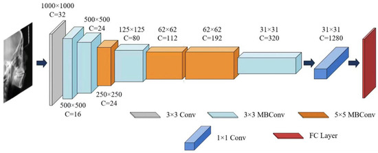 For the sex classification task, EfficientNet-B0 was trained to extract sex-discriminative imaging features from each training sample and compute probabilistic outputs based on these features [35,36], thereby characterizing patterns related to sexual dimorphism in growth and development. A summary of the EfficientNet-B0 architecture is provided in Table 2 and Figure 4.