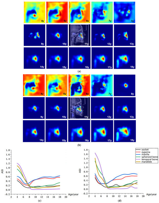 Figure 6a,b presents the age-related average saliency maps for females aged 4 to 18 years, illustrating the distribution of developmental saliency across craniofacial regions in LCR images. To clearly demonstrate the anatomical correspondence of these salient regions, the saliency map of a representative 11-year-old subject is overlaid onto their original LCR image, showing the precise spatial alignment between salient areas and anatomical structures. For visualization, the saliency intensity is mapped to a color gradient from blue to red, where increasingly red hues indicate higher age-related saliency in the corresponding craniofacial region.