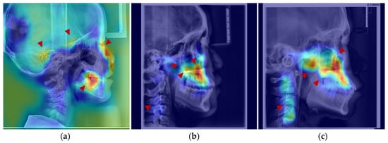 Anatomical structures exhibiting developmental saliency in average age-related saliency maps. (a) A 6-year-old female example (LCR with overlaid saliency map). Arrows indicate salient regions during the 4–7-year period: temporal bone, sphenoid region, orbit, and dentition. (b) A 12-year-old female example. Arrows highlight salient regions in the 8–12-year period: maxilla (tuberosity and palatine bone), zygomatic bone, pterygoid process, and cervical vertebrae. (c) An 18-year-old male example. Arrows point to salient regions in the 13–18-year period, including the maxilla, mandible, zygomatic bone, and cervical vertebrae.