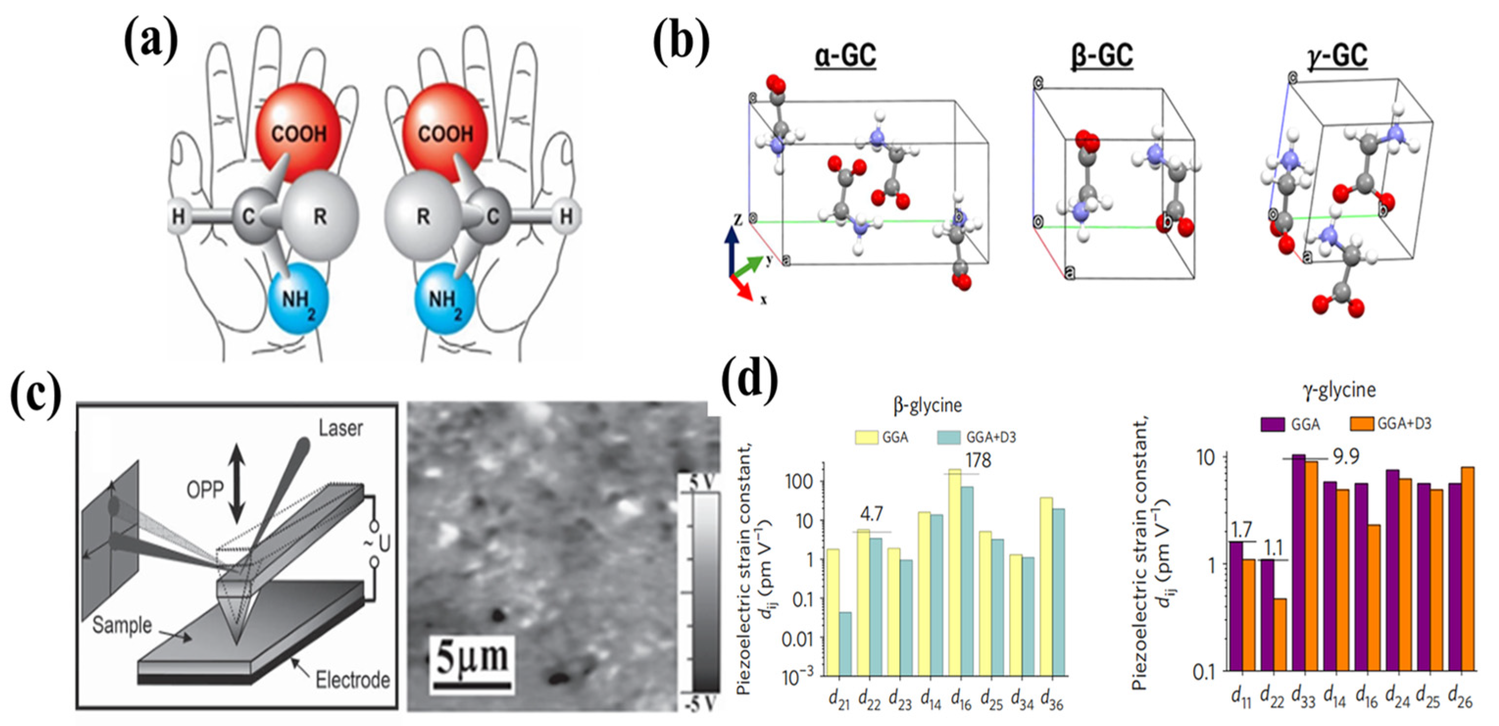 - Cheng, Y.; Wang, T.; Zhu, H.; Hu, X.; Mi, J.; Li, L.; Zhang, Y.; Yang, J.; Dong, L.; Li, Y.; et al. Molecular Engineering of Amino Acid Crystals with Enhanced Piezoelectric Performance for Biodegradable Sensors. Angew. Chem. Int. Ed. 2025, 64, 12897. [Google Scholar]