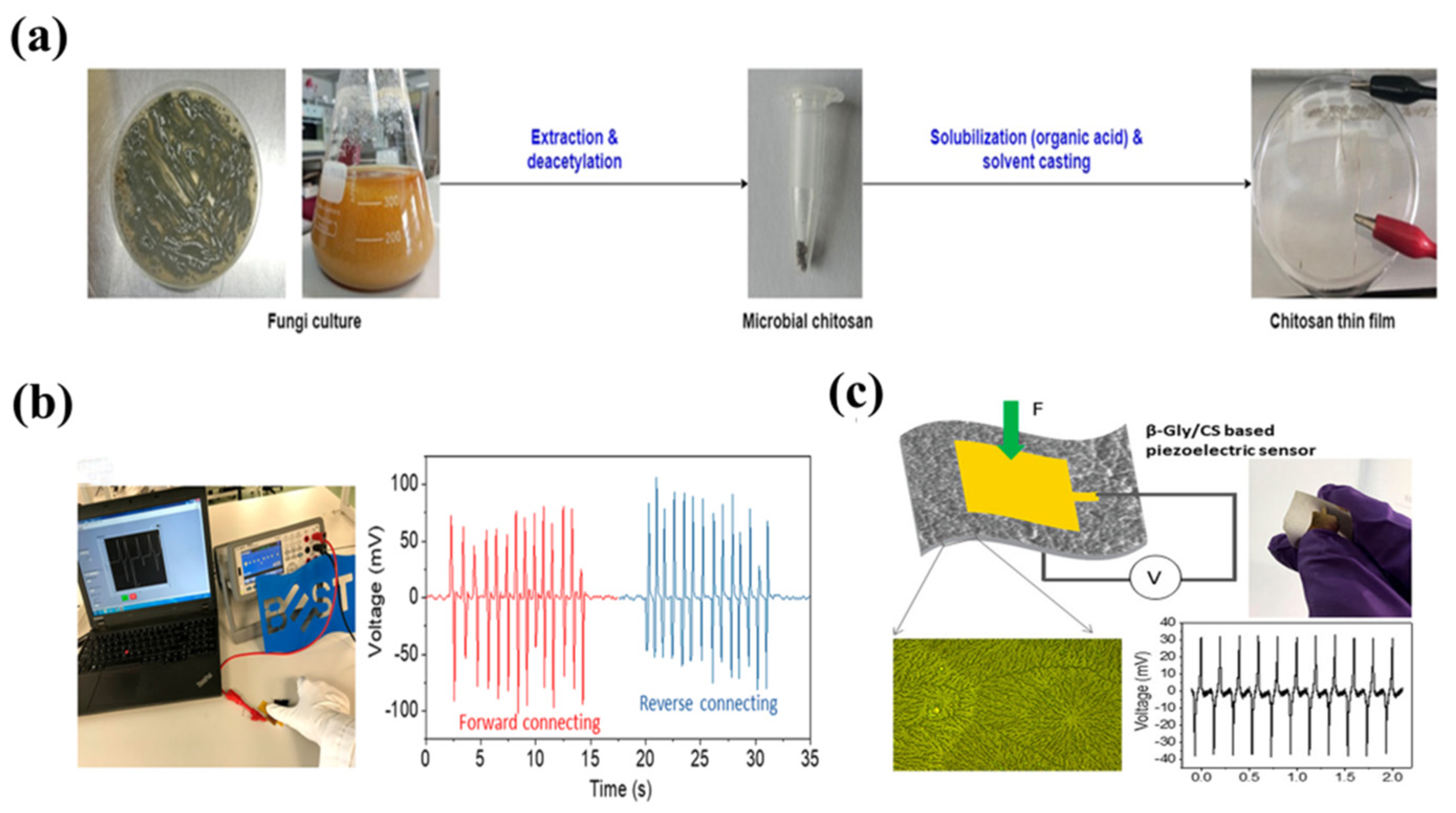 - Amran, A.; Ahmad, F.B.; Akmal, M.H.M.; Ralib, A.A.M.; Bin Suhaimi, M.I. Biosynthesis of thin film derived from microbial chitosan for piezoelectric application. Mater. Today Commun. 2021, 29, 102919. [Google Scholar] [CrossRef]