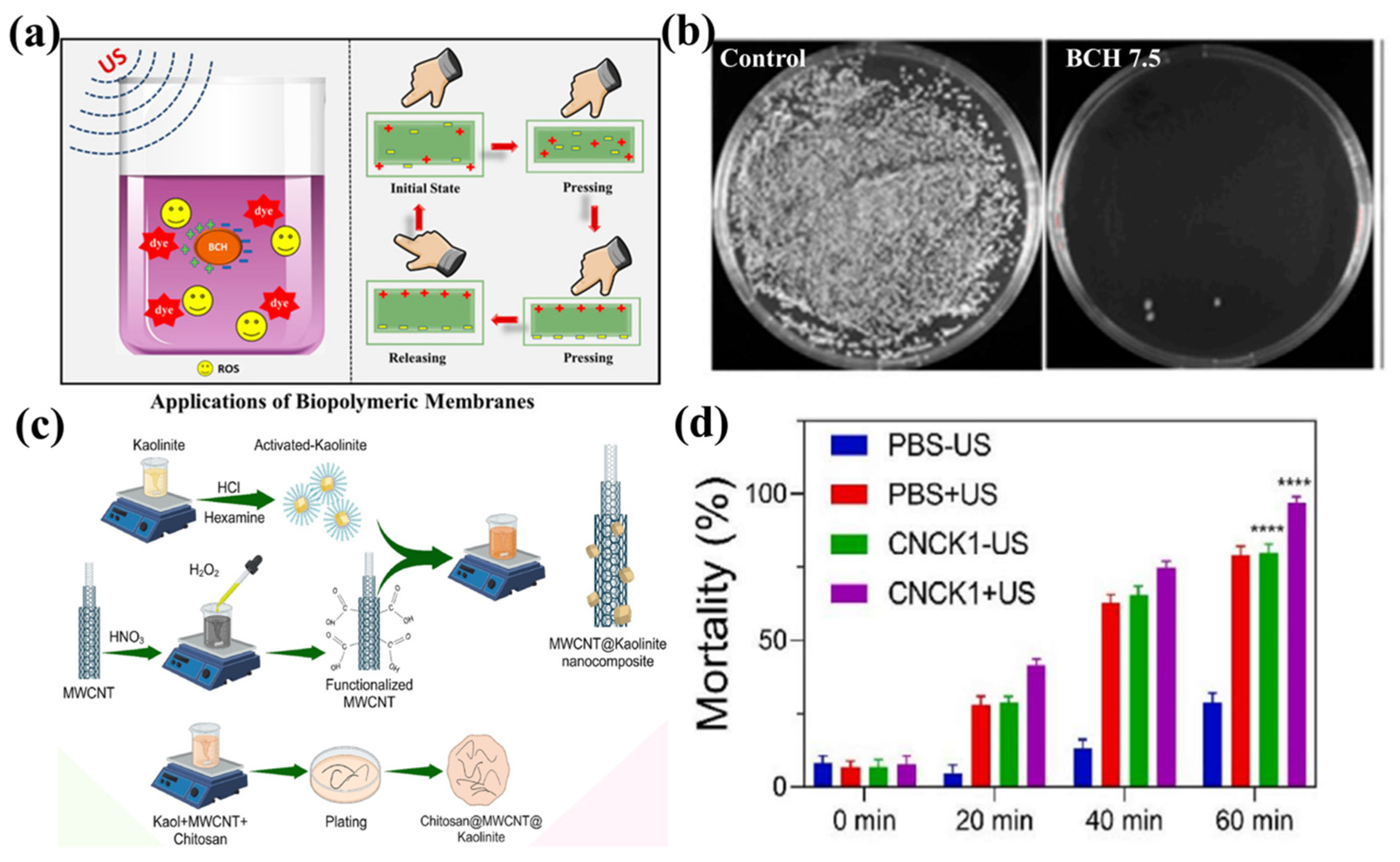 - Mondal, D.; Roy, S.; Sau, A.; Roy, J.; Bag, N.; Ullah, Z.; Ghosh, S.; Gong, T.; Madni, M.; Chakraborty, I. Chitosan cloaked MWCNT-kaolinite bio-nanocomposite for energy generation and ultrasound driven ROS induced degradation of organic dyes and pathogen. Ceram. Int. 2025, 51, 45744–45754. [Google Scholar] [CrossRef]