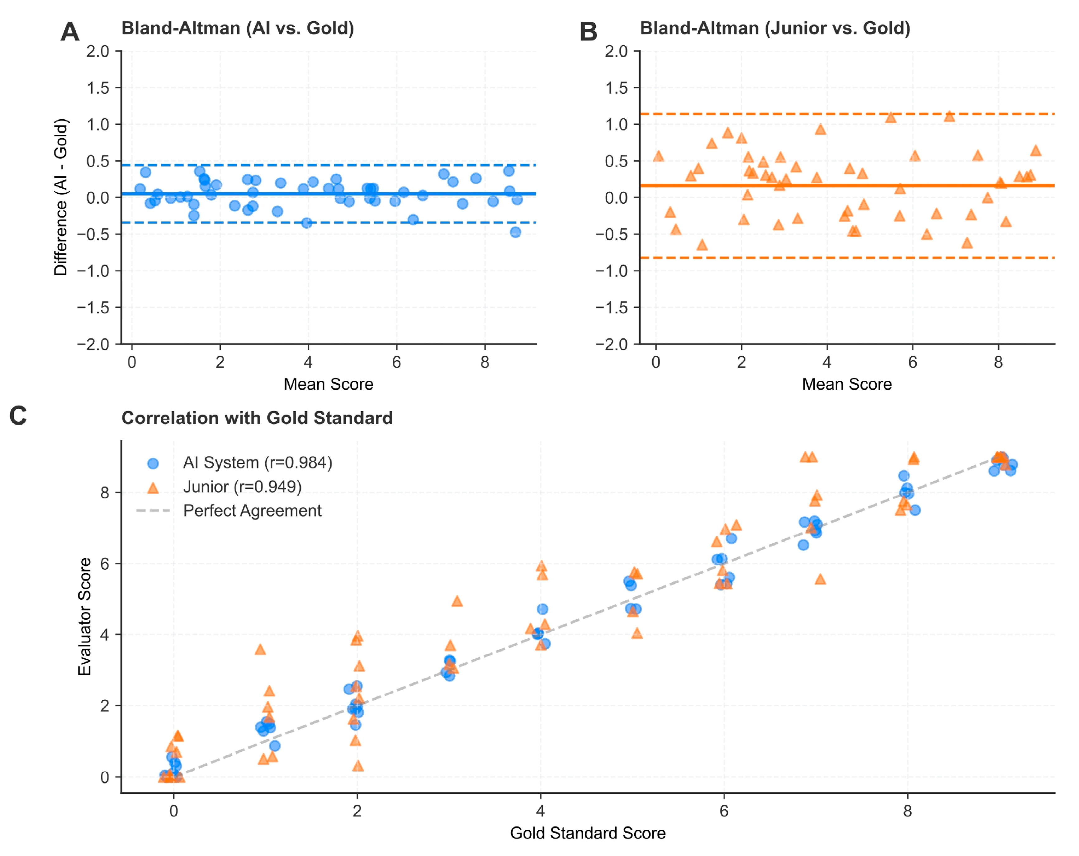 To statistically compare the performance differences between the AI system and junior endoscopists, McNemar’s test was used for paired nominal data (accuracy, sensitivity, and specificity). The difference in Kappa coefficients between the two groups was tested for statistical significance using a bootstrap-based test for equality of dependent kappa coefficients. The relationship between the AI scores and the gold standard was further analyzed using Pearson correlation coefficients (r) and Bland–Altman analysis to assess systematic bias.