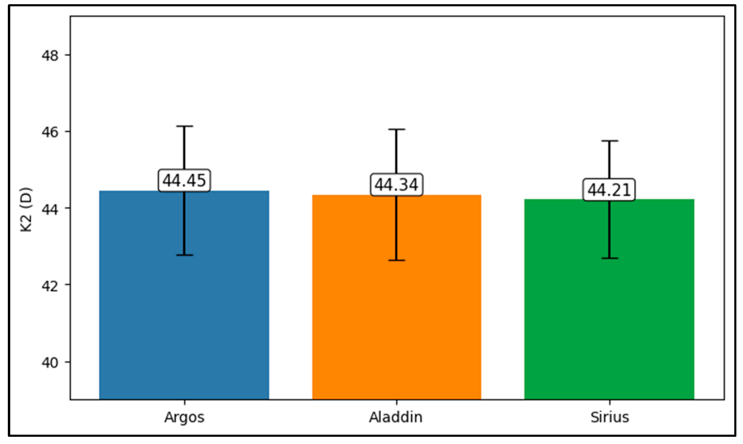 Argos derives keratometry from OCT information combined with a small, ~2.2 mm, LED ring sample; Aladdin computes keratometry from Placido-based reflections across an approximately ~3.0 mm zone (2.8–3.2 mm); and Sirius provides simulated keratometry derived from Placido/Scheimpflug-based anterior surface reconstruction (commonly reported as SimK around the central, ~3 mm). These differences in sampling geometry and reconstruction are expected to contribute to systematic differences across devices. Although Argos can derive CCT from OCT, in our routine reporting/export configuration CCT was not consistently available as a structured variable across the full retrospective period; therefore, CCT agreement was evaluated between Aladdin and Sirius where CCT was consistently captured.