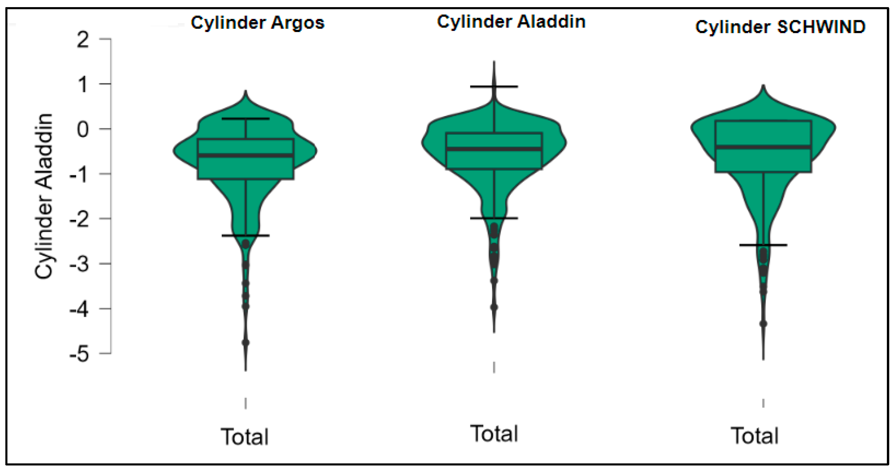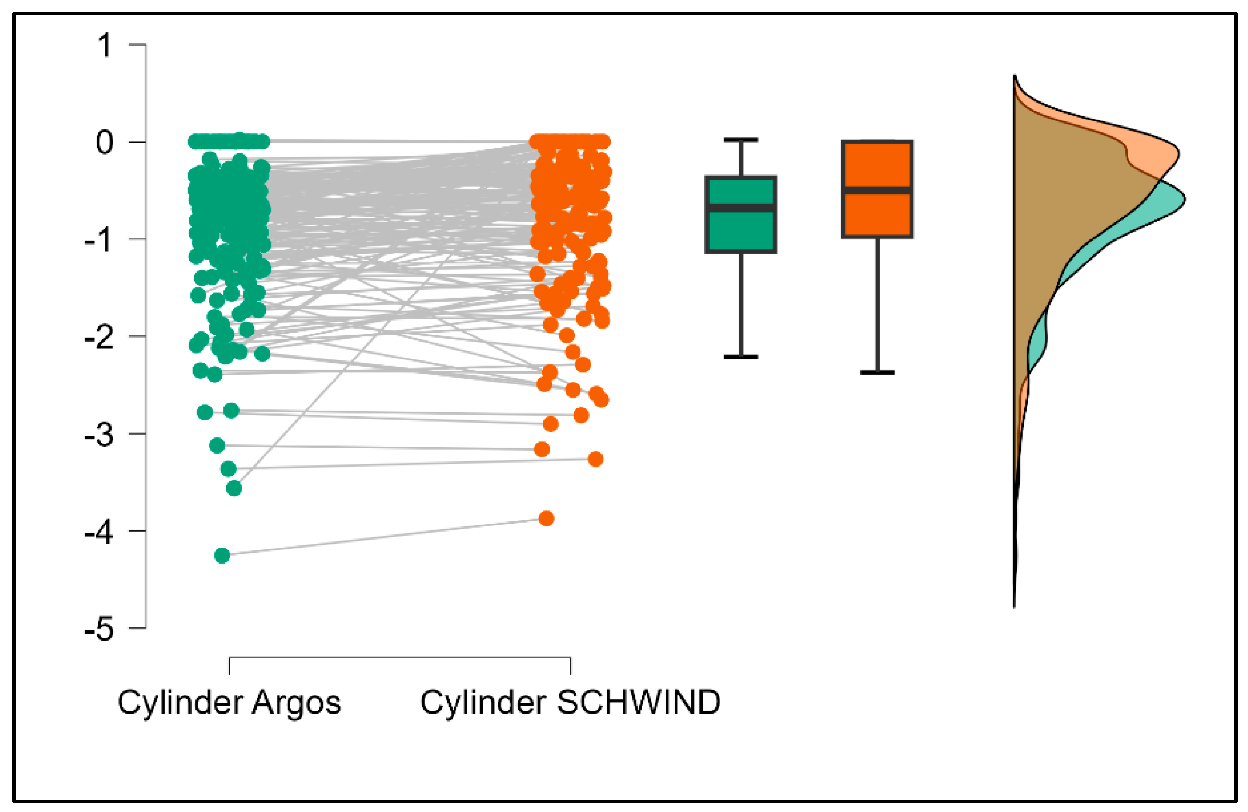 p = 0.003). This pattern of difference is further accentuated by the significantly lower cylinder values observed with Argos compared to Schwind (Mann–Whitney U test,