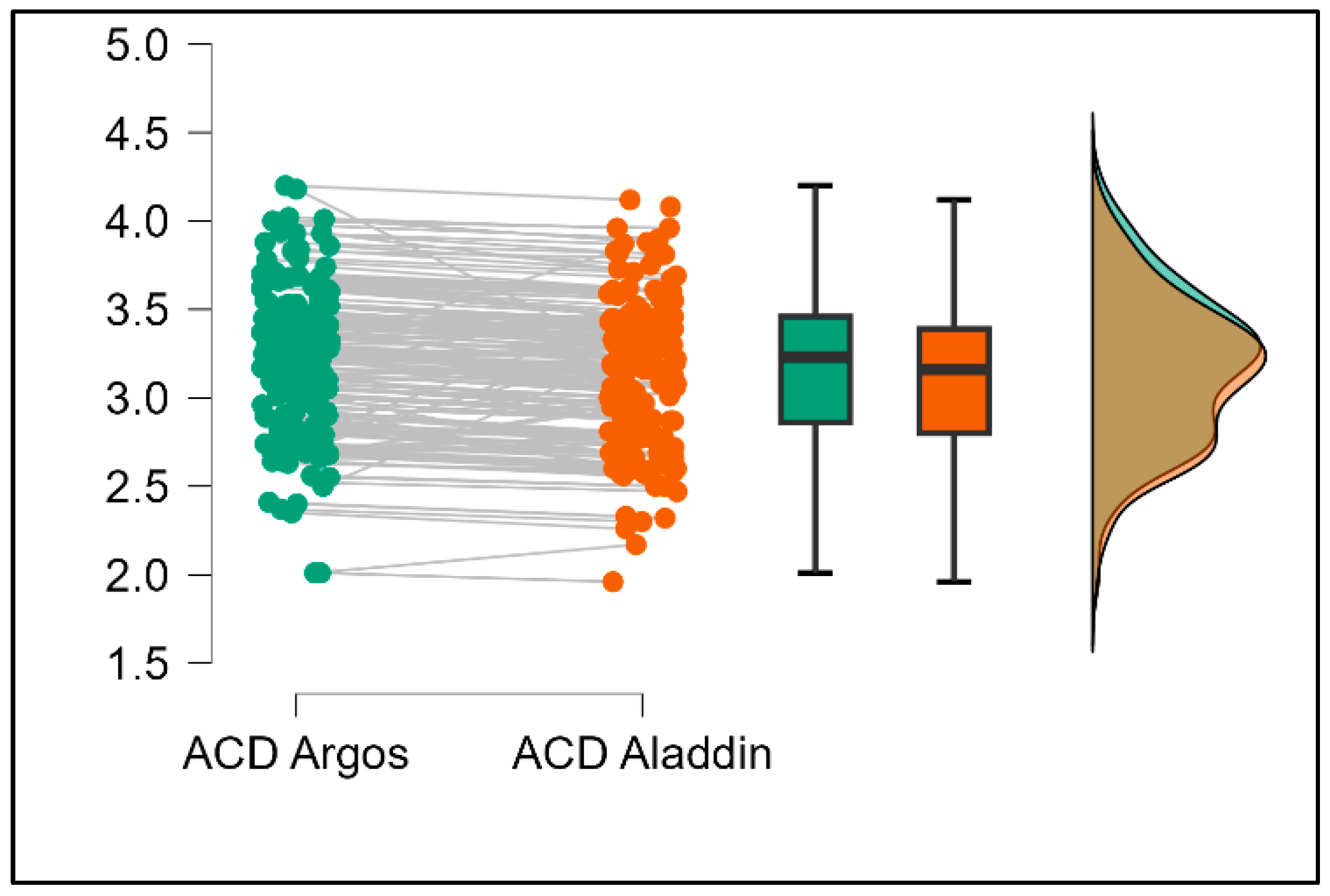Measurements of axial length, anterior chamber depth, lens thickness, and white-to-white distance were consistently higher when obtained using the Argos SS-OCT biometer compared to the Aladdin OLCI device. These findings are consistent with previously reported data demonstrating systematic offsets between SS-OCT-based and OLCI-based biometers, likely related to differences in segmentation algorithms, refractive indices, and signal penetration depths [