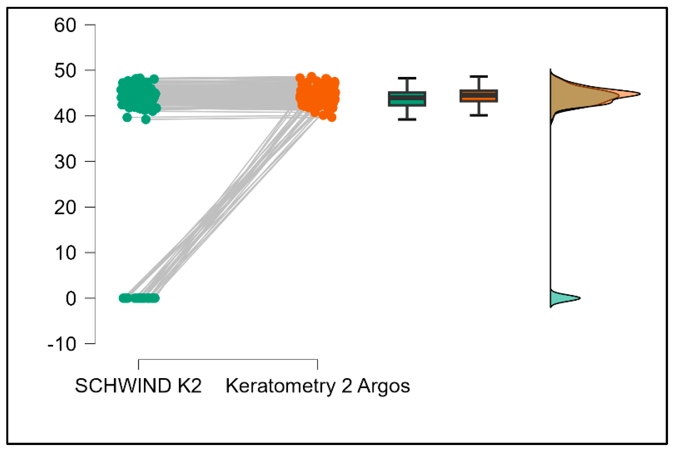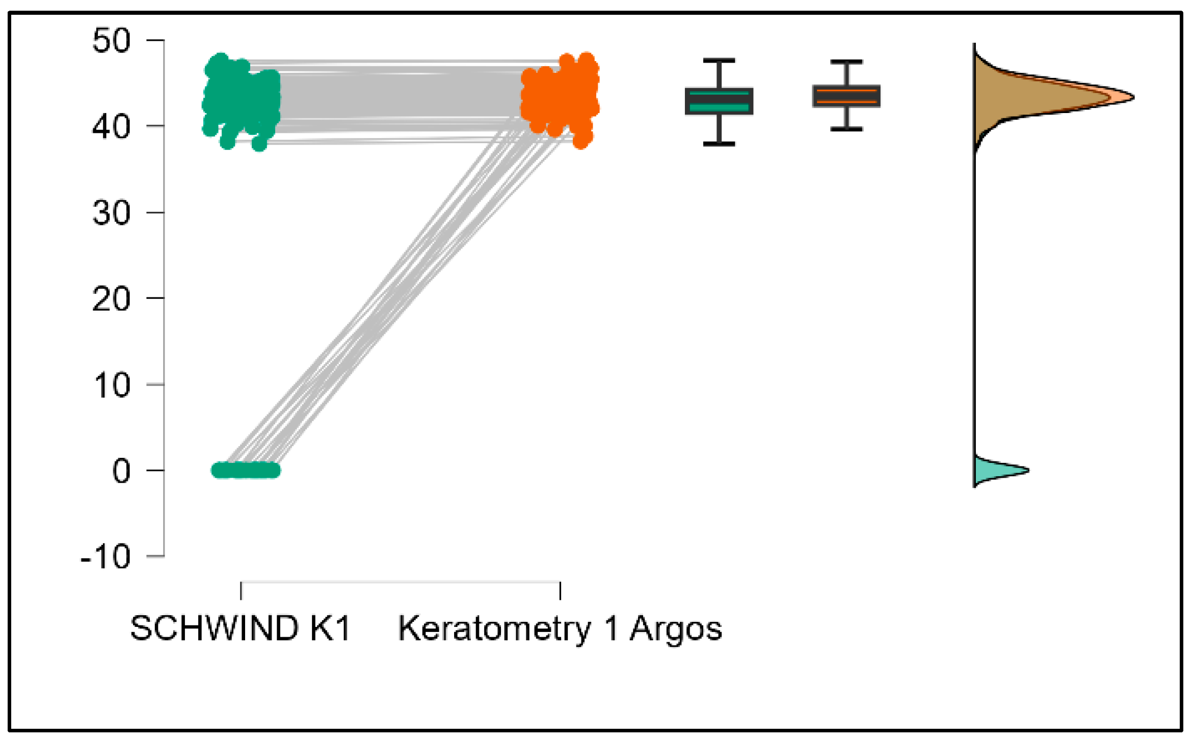 Table 3 compares the values of keratometry readings, astigmatism axis (degrees), and cylinder between the Argos and Schwind devices. The analysis revealed that both K1 and K2 measurements from Argos were significantly higher than those from Schwind (