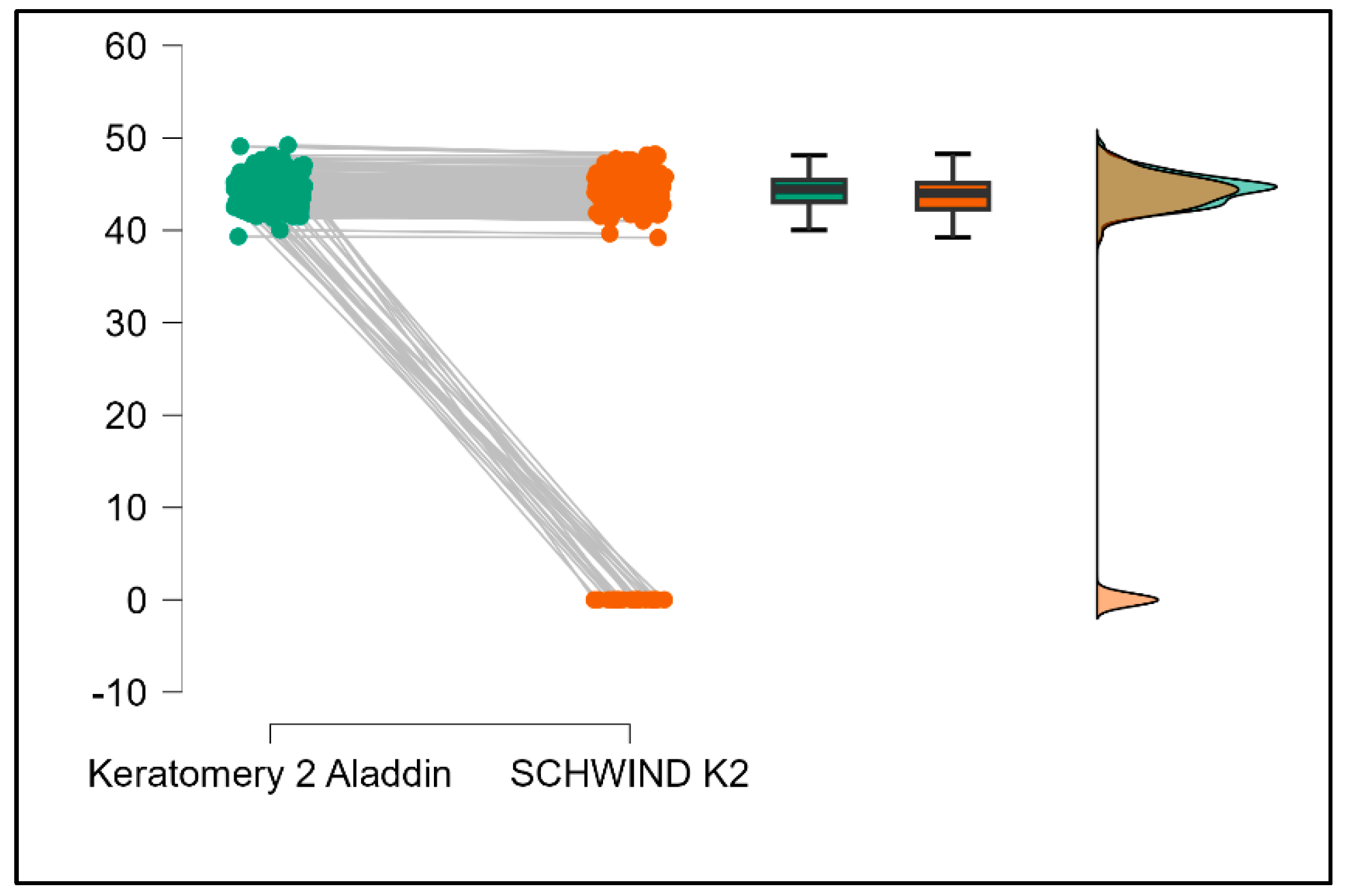 Table 4 shows statistically significant differences in K1, K2, astigmatism axis (degrees), and cylinder measurements when comparing the Aladdin and Schwind devices, with Aladdin consistently yielding higher values across these parameters (