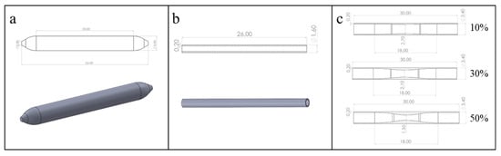Geometric models of the DCB and blood vessels: (a) DCB model; (b) the ex vivo vessel model; (c) vessel models with different stenosis rates (10%, 30%, 50%).