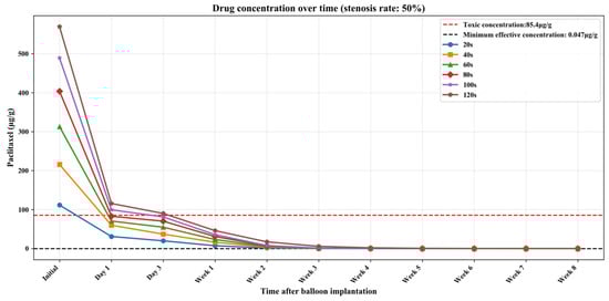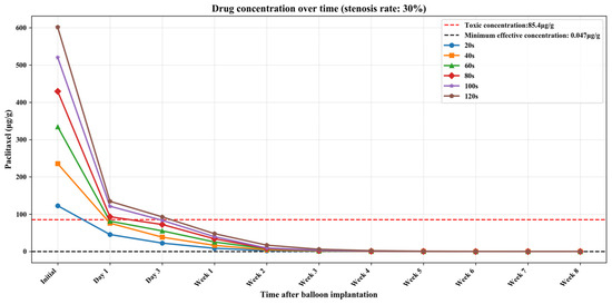 Tables S1–S3 (Supplementary Materials) show the numerical simulation results of drug concentration changes over time under different balloon dilation times in vessels with stenosis rates of 10%, 30%, and 50%, respectively. In addition, Figure 8, Figure 9 and Figure 10 show that: (1) in vessels with the same stenosis rate, if the balloon dilation time is longer, the initial drug concentration in the vessel after the balloon is withdrawn will be higher; and (2) after the balloon is withdrawn, the paclitaxel concentration in the vessel will gradually decrease over time. The paclitaxel concentration in the vessel decreases faster within the first 24 h after the balloon is implanted and then slows down after 24 h. Analysis of the numerical simulation results shows that at the 10% stenosis rate, the optimal balloon dilation time should be 20 s. Under this dilation duration, the paclitaxel concentration in the blood vessel will drop below the toxic concentration within 24 h after balloon implantation and remain within the effective concentration range for the longest duration (about 6 weeks). Similarly, for the 30% vascular stenosis, the optimal balloon dilation time should be 60 s (with effective concentration duration for about 6 weeks). For the 50% vascular stenosis, the optimal balloon dilation time should be 80 s (with effective concentration duration for about 6 weeks).