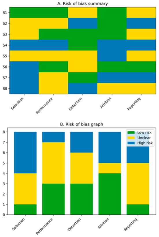 Risk-of-bias assessment of included studies. Preclinical animal studies were evaluated using the SYRCLE risk-of-bias tool, while clinical and translational studies were assessed using the ROBINS-I tool. Overall, the risk of bias was moderate to high, primarily due to limited randomization, lack of blinding, and heterogeneous outcome reporting.