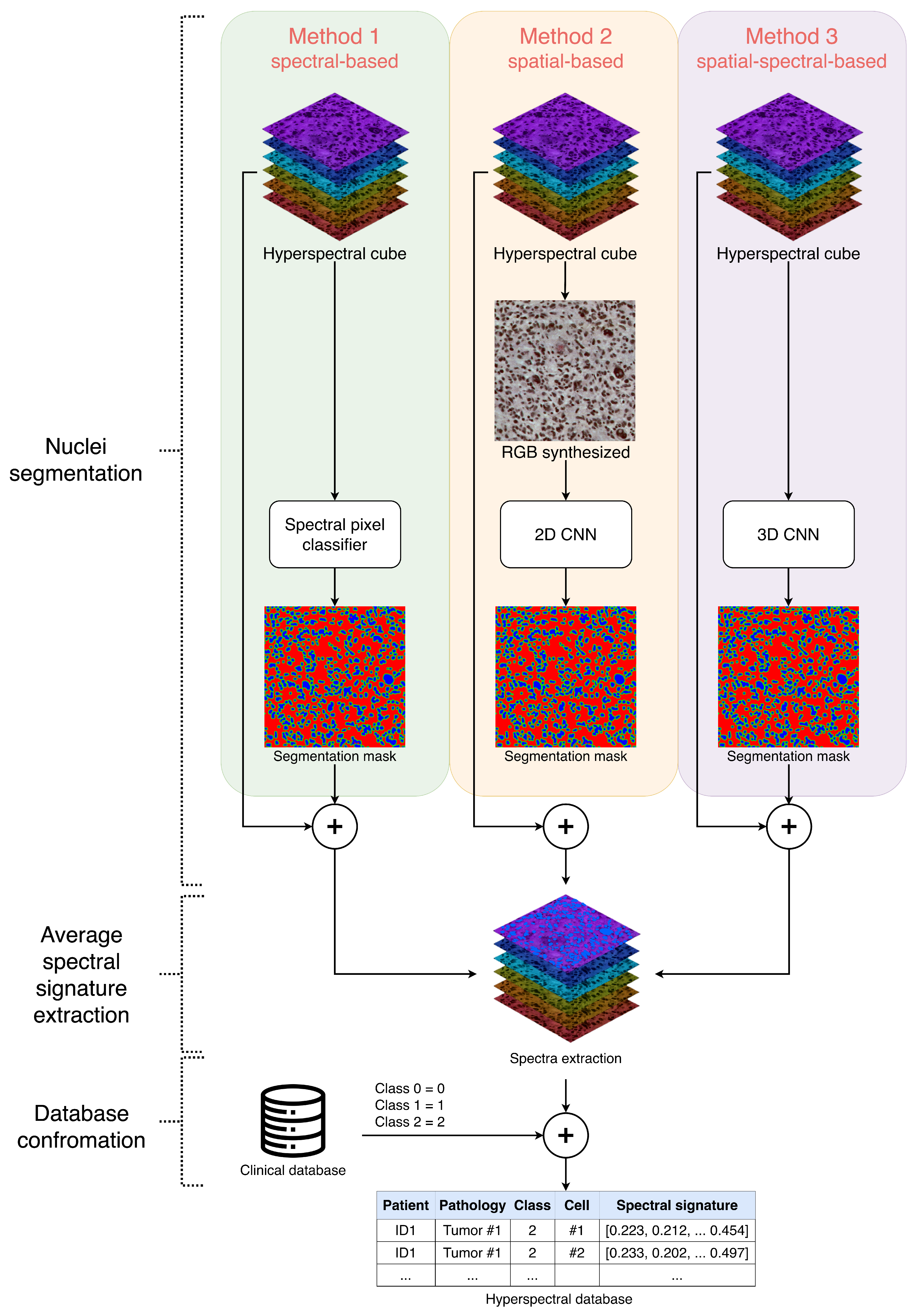 Section 2.2.3). Regardless of the segmentation method chosen, each one produces produces a nuclei segmentation map, from which individual cells are identified by grouping spatially adjacent nuclear pixels. In the final step of the proposed pipeline, the average spectral signature of each segmented nucleus is computed and automatically labeled using the available clinical information, resulting in a structured and clinically meaningful hyperspectral database.