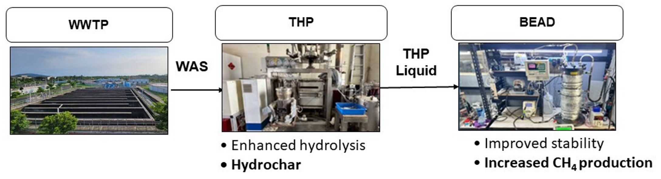 In this study, the synergistic performance of an integrated THP-BEAD system is systematically evaluated. We investigate how hydrothermal severity (120 and 150 °C) controls organic matter solubilization, carbon partitioning, and energy demand, and how the resulting feedstocks affect BEAD performance under varying HRTs and OLRs. By jointly analyzing methane production, load-response behavior, solid-phase properties, and energy implications, this work aims to establish a regime-based operational framework for high-rate sludge digestion. This integrated approach is expected to enable compact reactor configurations, enhance energy recovery, and reduce residual solids management costs in high-density urban wastewater treatment systems.