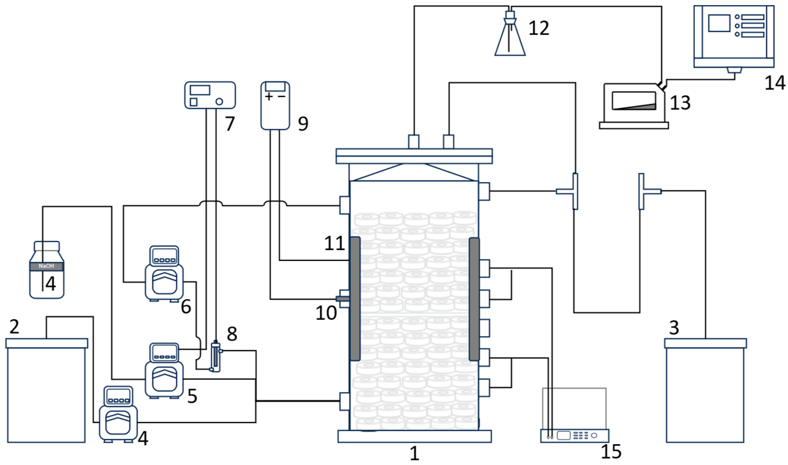 Two pairs of electrodes (two anodes and two cathodes) were installed in the reactor. The electrodes were constructed from conductive biorings made of polypropylene blended with 15 wt% Carbon Black (CB), forming a flow-through three-dimensional conductive matrix for biofilm attachment and charge transfer. Electrical separation between anodes and cathodes was achieved using non-conductive PVC mesh spacers (approximate thickness of 1 mm). Titanium wires connected to carbon felt strips placed in the middle of each electrode compartment were used as current collectors to ensure uniform current distribution across the electrode beds. The electrodes were connected to a power supply (KORAD KD3005P, Dongguan KORAD Technology Co., Ltd., Dongguan, China) and operated with periodic polarity reversal.