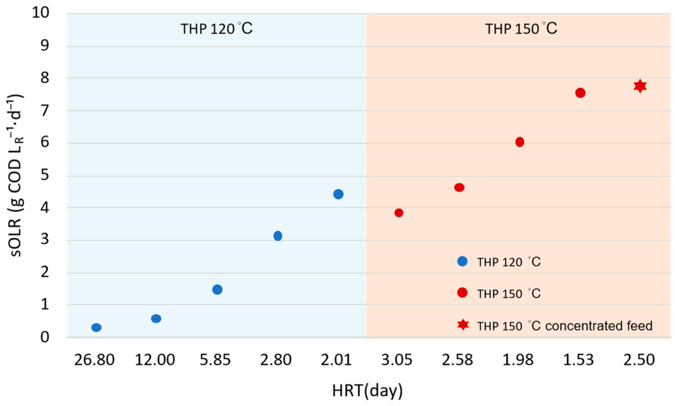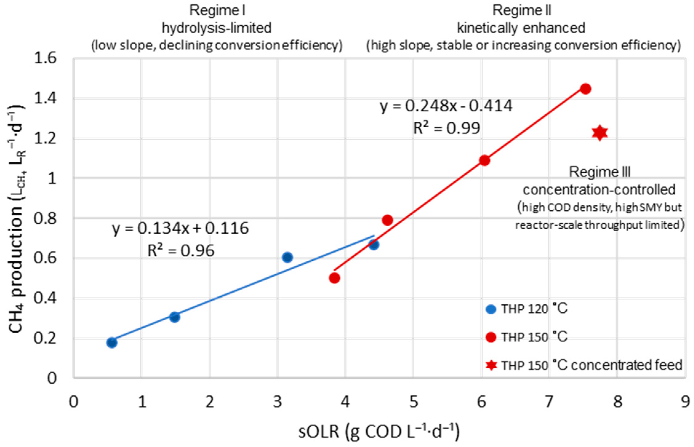 Figure 5, methane production exhibited an approximately linear dependence on sOLR for both pretreatment temperatures within the investigated range of sOLR values. However, the distinctly different slopes of the trendlines reveal a fundamental shift in the factors affecting methane production as a function of THP severity.