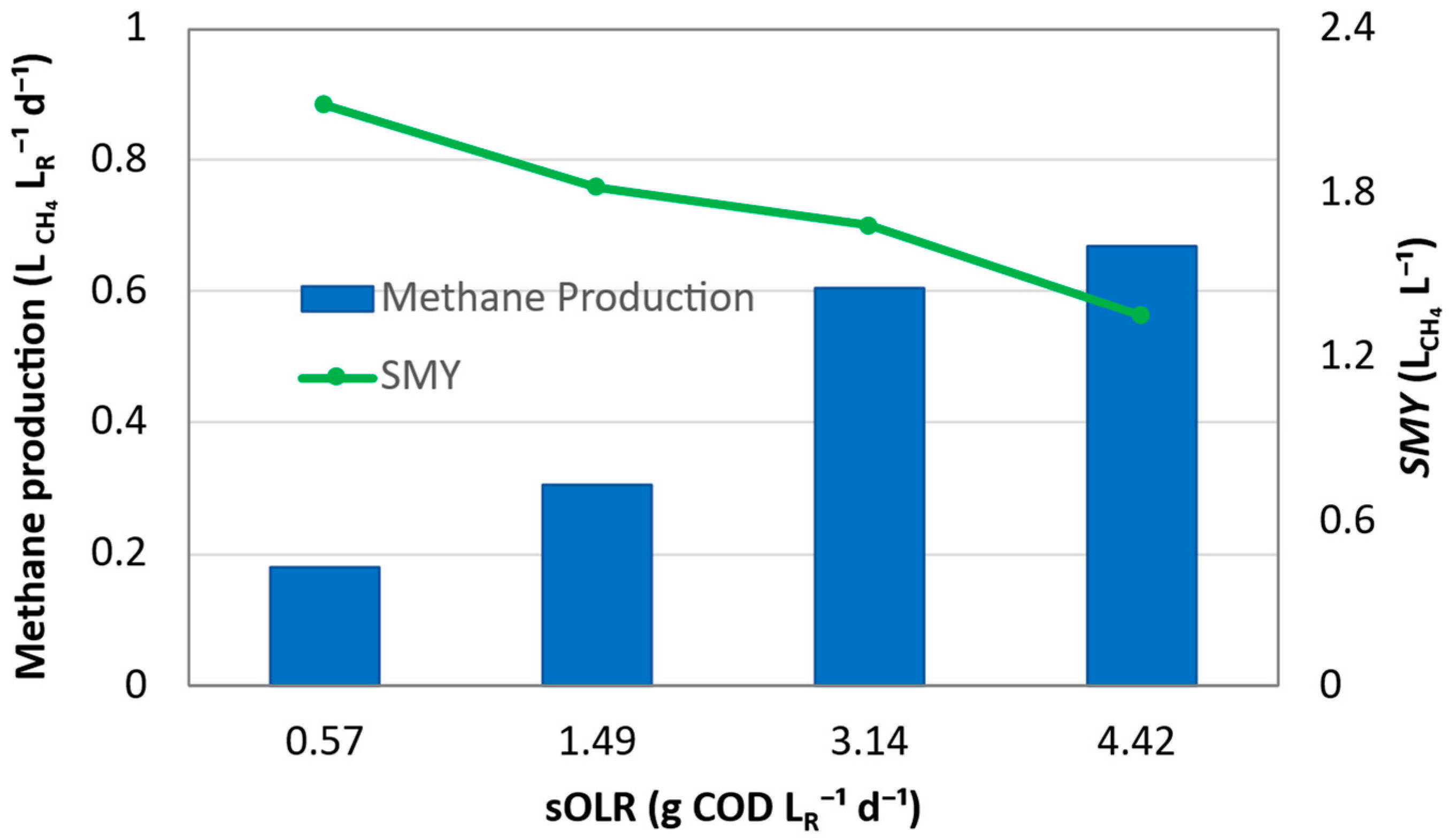 −1 for all tested sOLR values, and no decrease in the COD-based methane yield with increasing sOLR was observed. Interestingly,