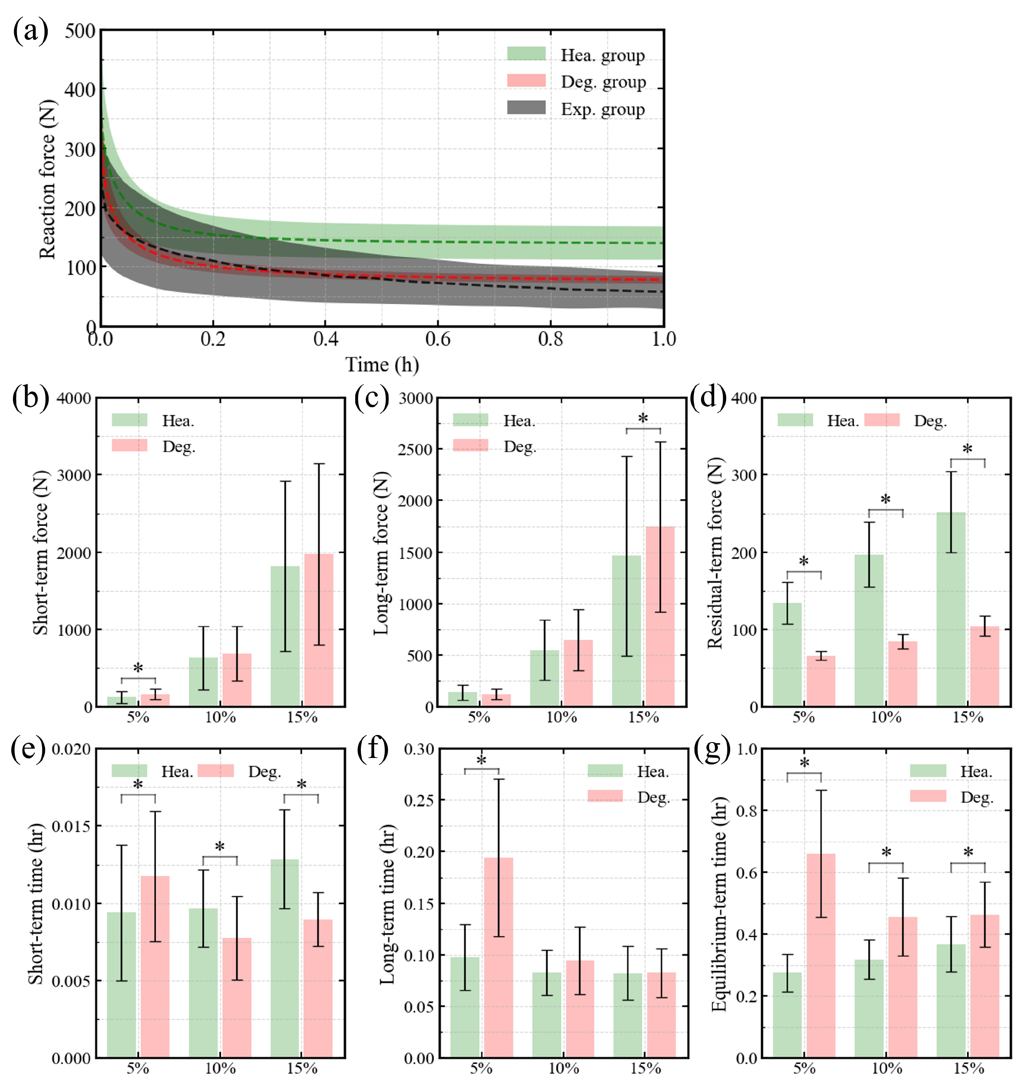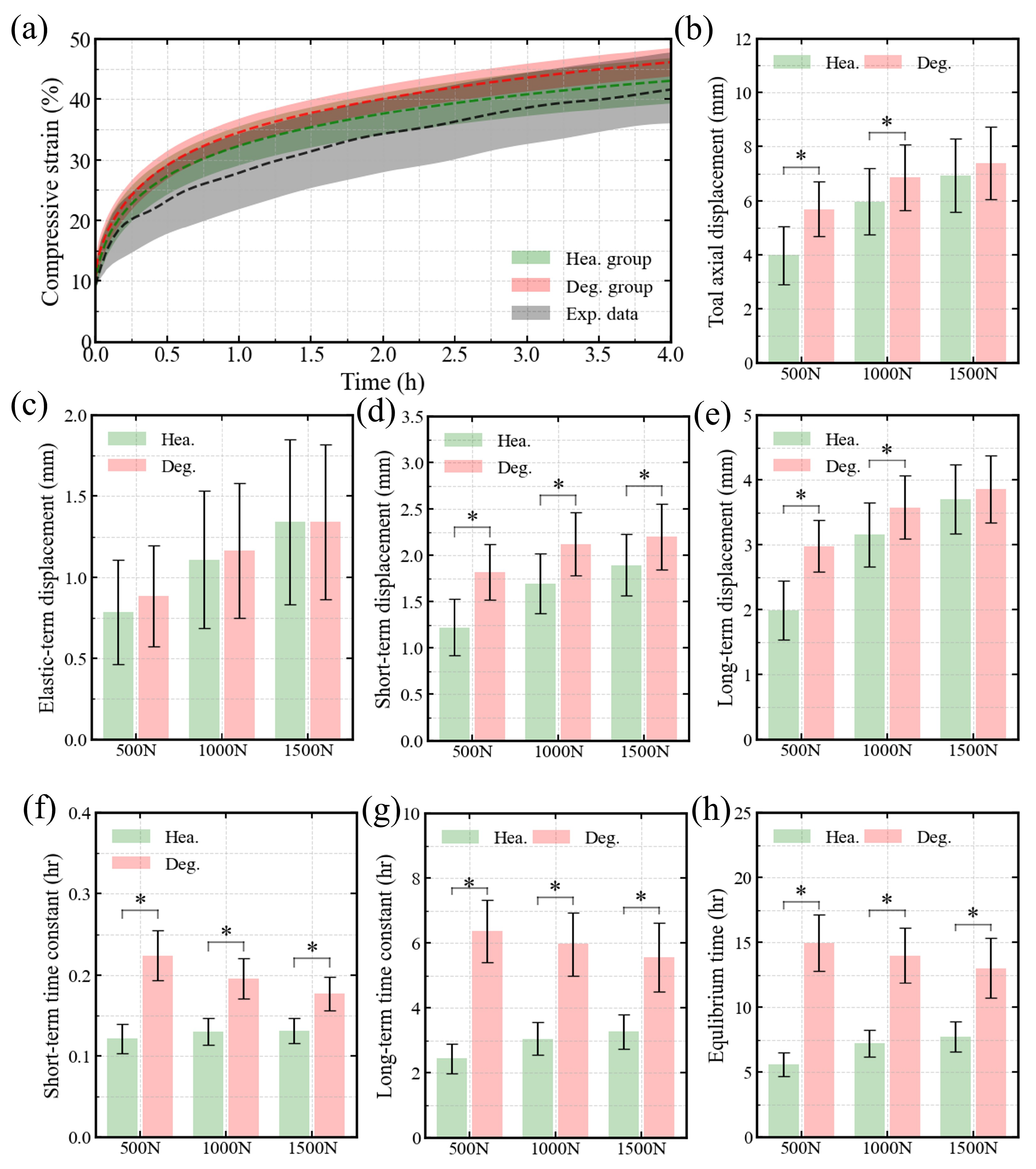 | Creep | Pre-compression 20 N | Compressive force | Load from 20 N to 500, 1000, or 1500 N in 1 s, 2 s, or 3 s, respectively, and then hold constant for 30 h | [3] |