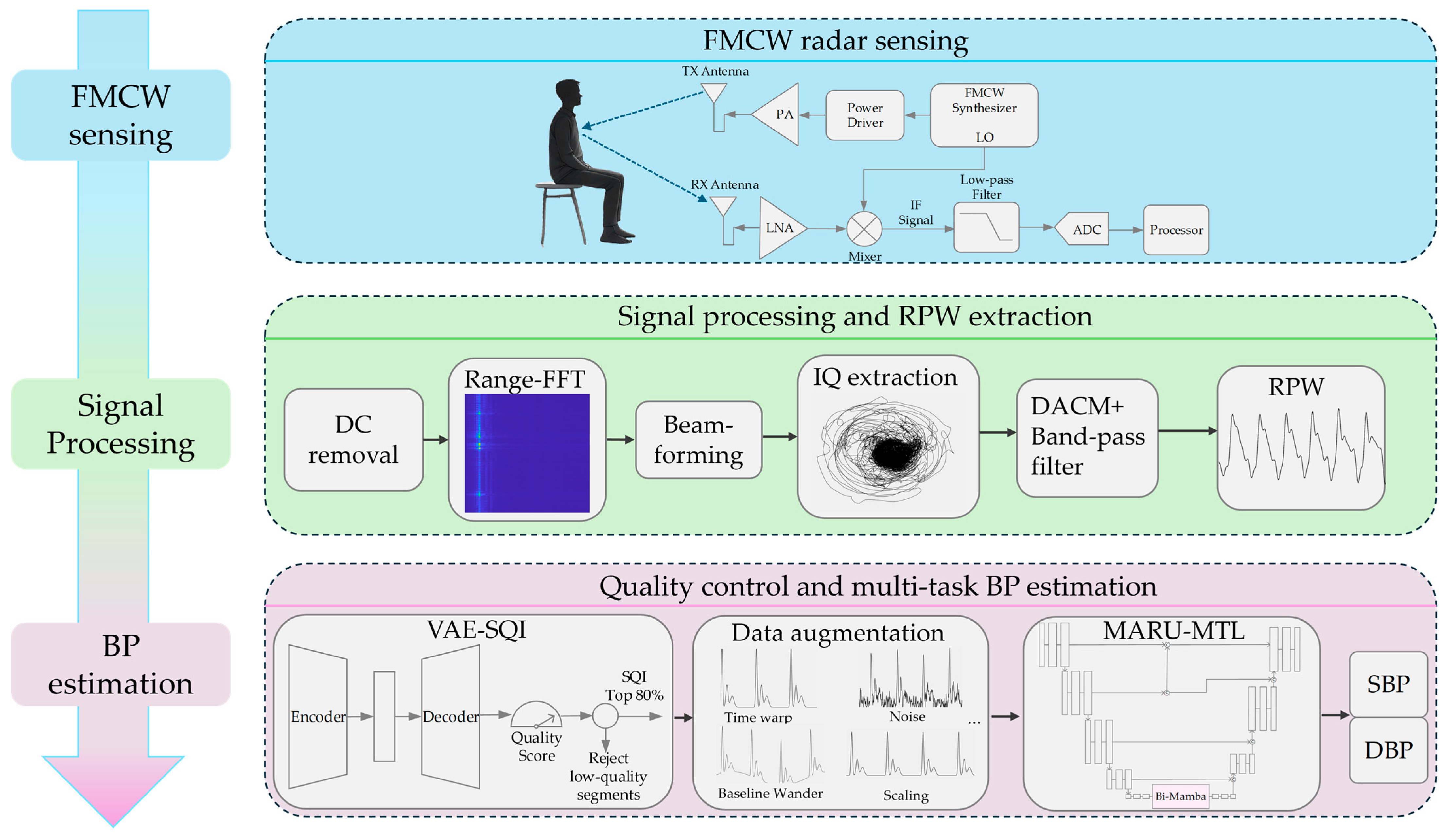 - Wang, P.; Yang, M.; Zhang, X.; Wang, J.; Wang, C.; Jia, H. Non-Contact Blood Pressure Monitoring Using Radar Signals: A Dual-Stage Deep Learning Network. Bioengineering 2025, 12, 252. [Google Scholar] [CrossRef] [PubMed]