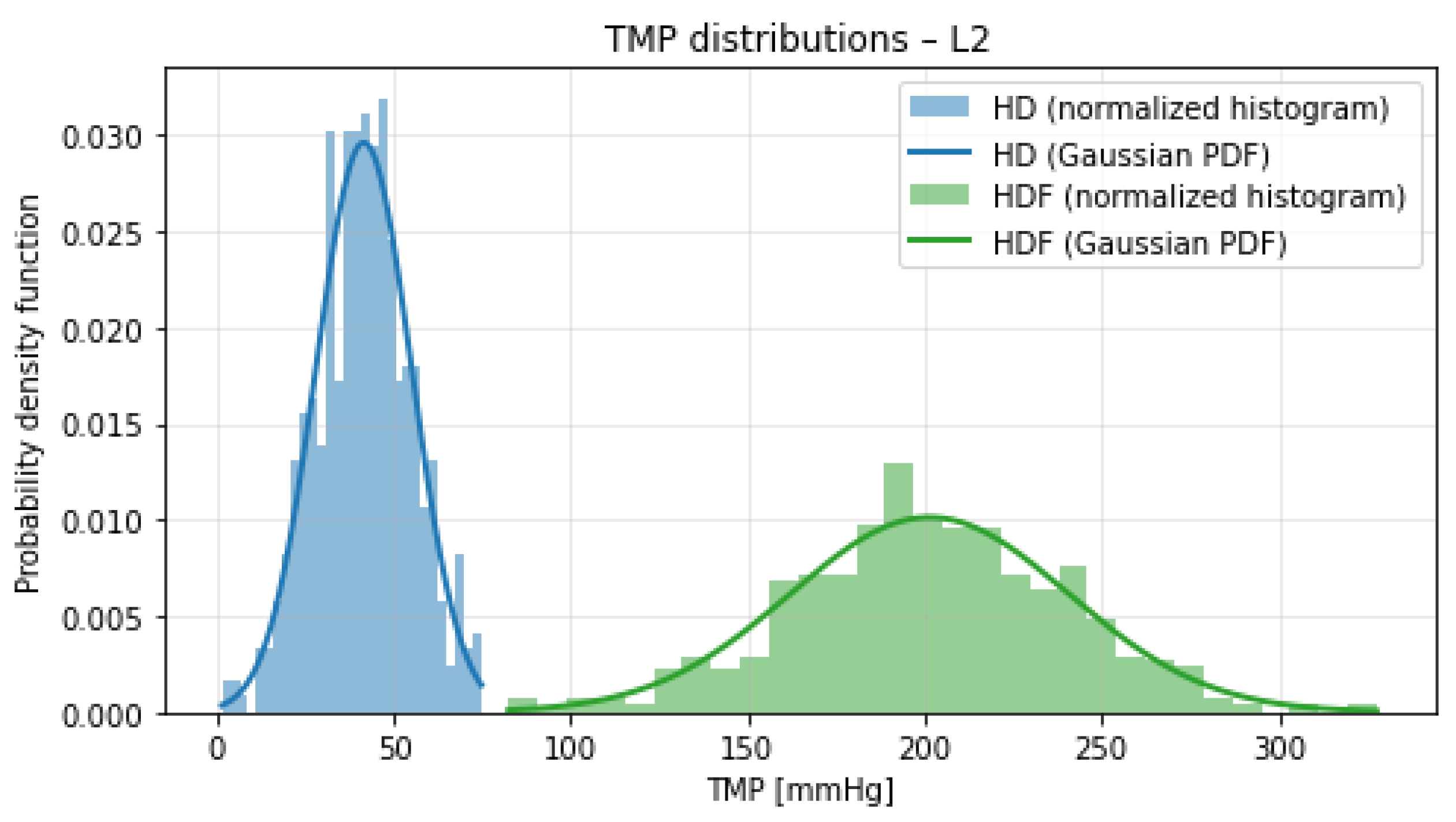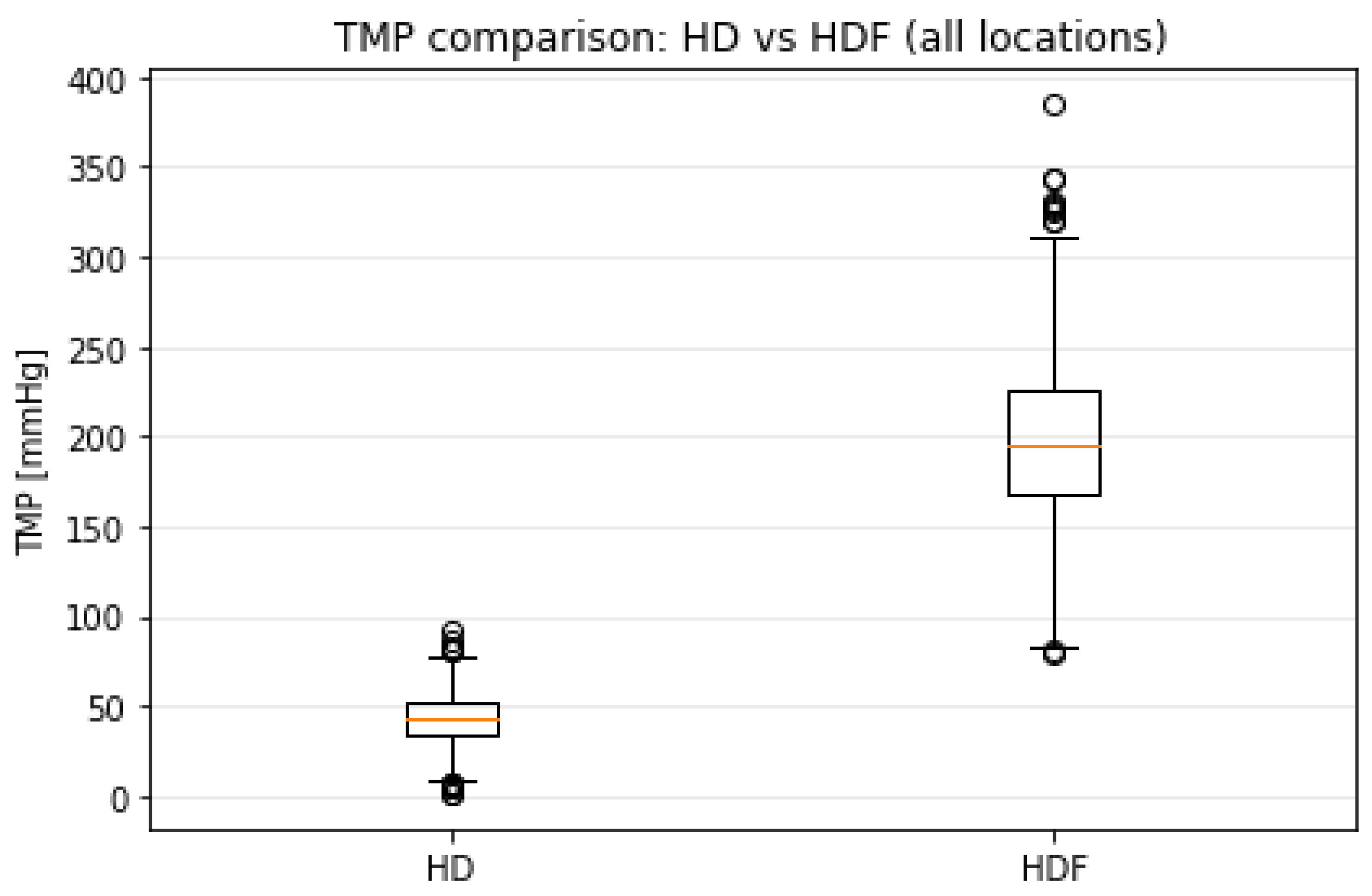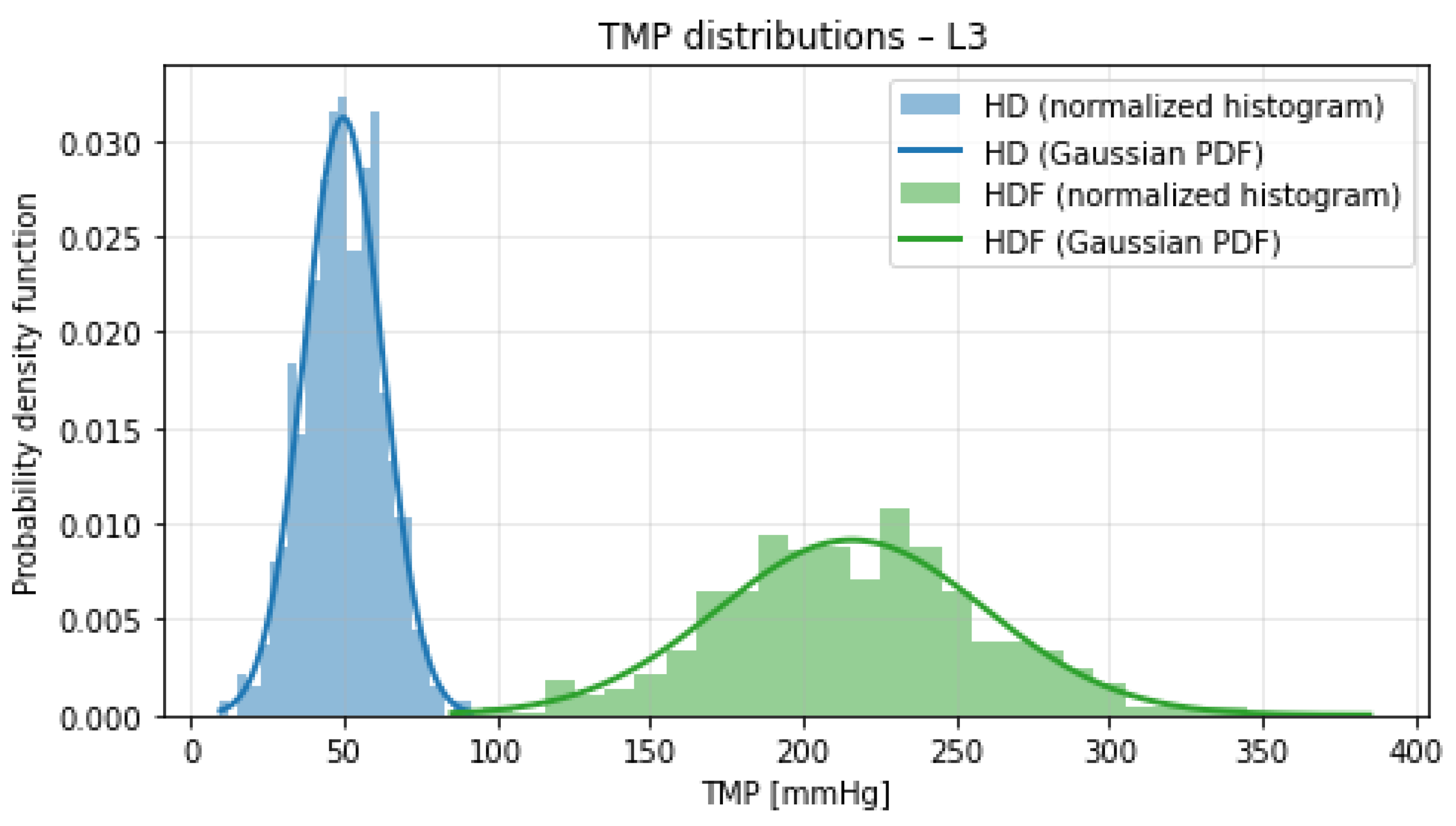 Importantly, within the approximately 20 routine observations available per centre and modality, no TMP values exceeding 300 mmHg were reported during routine operation. The clear and reproducible separation between HD and HDF pressure regimes across geographically distinct centres suggests stable operational behaviour under real-world clinical conditions. These empirically observed intervals form the basis for the subsequent statistical modelling and synthetic data generation.
