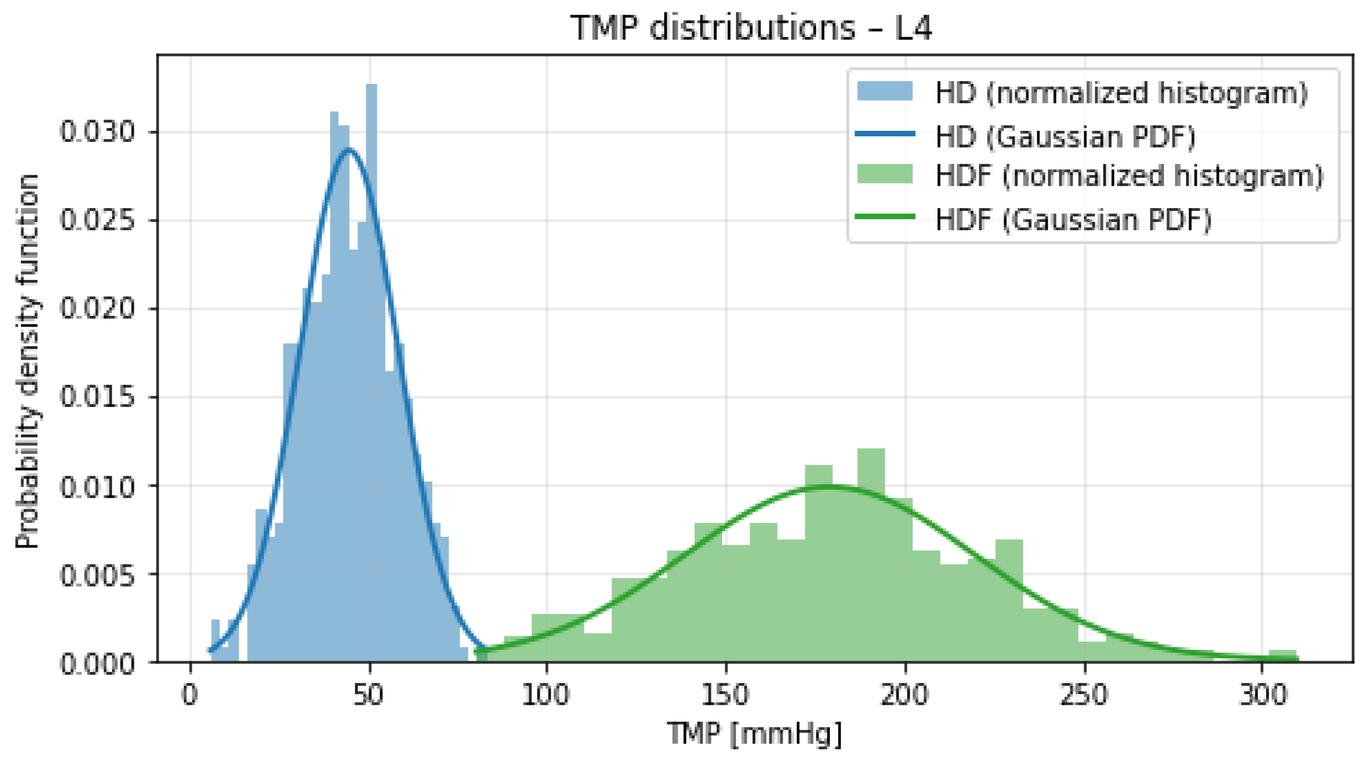 Figure 4 illustrate the normalized histograms of synthetic transmembrane pressure (TMP) values for haemodialysis (HD) and haemodiafiltration (HDF) across the four participating dialysis centres. The synthetic distributions were generated using centre-specific mean values and dispersion parameters derived from the clinically observed intervals under the assumption that the reported range corresponds to approximately three standard deviations of the underlying process.