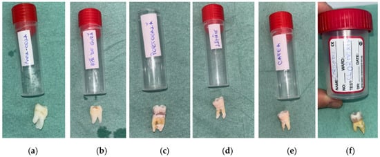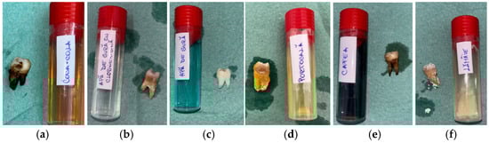 Macroscopic appearance of enamel specimens after 5 days: (a) Coca-Cola (RCC)—brown discoloration and marginal staining; (b) mouthwash with chlorhexidine (RAC)—thin whitish residue at the cervical area; (c) mouthwash without chlorhexidine (RA)—slightly whitened surface (RA); (d) orange juice (RP)—chalky, opaque crown surface; (e) coffee (RC)—brown surface staining; (f) lemon juice (RL)—whitish mineral deposits on crown and root.