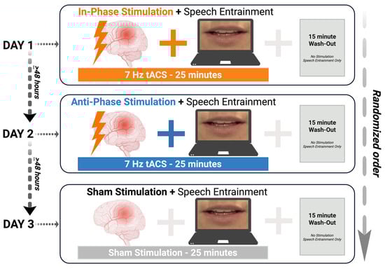 Participants were enrolled in a within-subjects, sham-controlled trial with a pseudorandomized block design. Over three days, each visit was separated by at least 48 h. Participants underwent three trials of an HD-tACS + speech entrainment (SE) paradigm under the following conditions: (1) theta-tuned (7 Hz) HD-tACS in-phase montage, (2) theta-tuned (7 Hz) HD-tACS anti-phase montage, and (3) HD-tACS sham condition. HD-tACS (1 mA at 7 Hz) targeted intact anterior (inferior frontal gyrus; pars opercularis; IFGpo) and posterior (posterior middle temporal gyrus; pMTG) regions in the left hemisphere. HD-tACS was applied at 7 Hz, a frequency band involved in human speech-syllable processing [80] and associated with neural oscillatory patterns for audiovisual processing [69,70]. It was hypothesized that an exogenous boost of in-phase theta coupling via HD-tACS would enhance frontotemporal network connectivity and facilitate neural integration across intact anterior and posterior regions, thereby improving speech entrainment performance. The study was double-blinded, with pseudorandomized scripts and stimulation conditions. Figure 1 illustrates the experimental design.