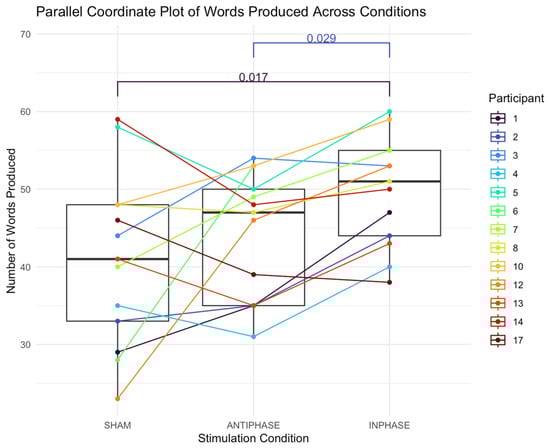The median number of words in the sham condition was 41 (IQR: 15; 38.5–53.0). The median number of words in the anti-phase condition was 47 (IQR: 15; 44–55). The median number of words in the in-phase condition was 51 (IQR: 11; 44–55). A Friedman test revealed a significant main effect of condition on the number of words produced: χ2 (2) = 9.38, p = 0.009 (Figure 4). The effect size, calculated using Kendall’s W, was 0.36, indicating a moderate effect (Cohen’s guidelines for W [99]: 0.1–<0.3 (small), 0.3–<0.5 (moderate), and ≥0.5 (large)). Post hoc analysis was performed using Nemenyi’s test with a multiple-comparison adjustment to determine which conditions differed significantly. The results revealed significant differences between in-phase stimulation and sham conditions (p = 0.017) and anti-phase stimulation and in-phase conditions (p = 0.029).