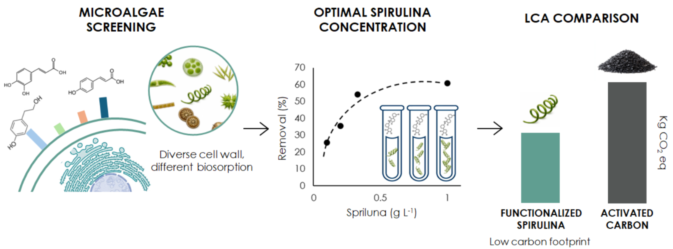 4.2. Limnospira Platensis as Biosorbent (Capacity and LCA Outcomes)