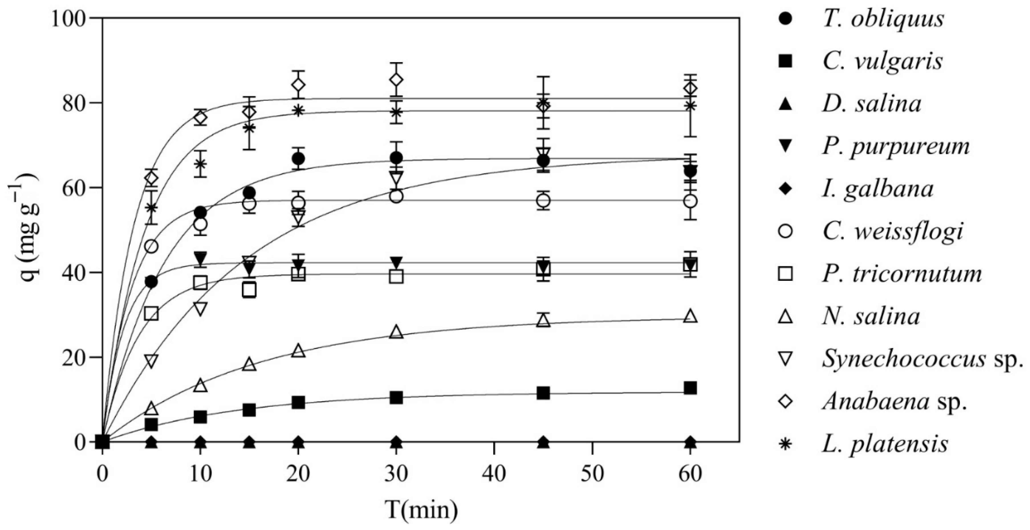 - Gu, S.; Lan, C.Q. Lipid-extraction algal biomass for biosorption of bivalent lead and cadmium ions: Kinetics and isotherm. Chem. Eng. Sci. 2023, 276, 118778. [Google Scholar] [CrossRef]