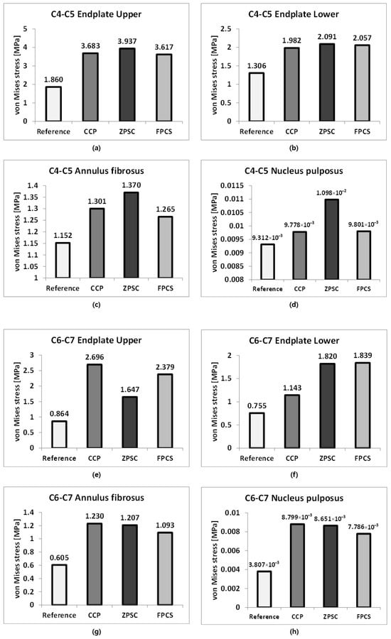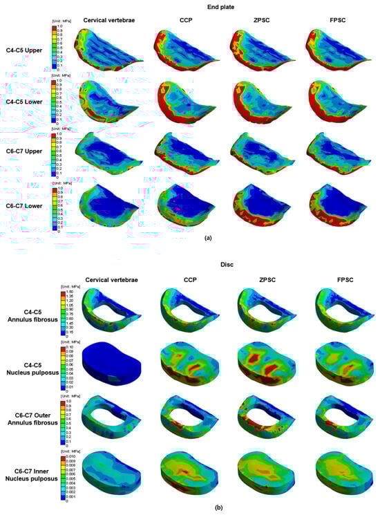 The representative von Mises stress values for the C4–C5 intervertebral disc were evaluated across four regions: the upper endplate, lower endplate, annulus fibrosus, and nucleus pulposus. In the reference model, stress values were 1.860, 1.306, 1.152, and 9.312 × 10−3 MPa, respectively. The CCP model showed increased upper and lower endplate stress to 3.683 and 1.982 MPa, and elevated stresses in the annulus fibrosus and nucleus pulposus to 1.301 and 9.778 × 10−3 MPa. The ZPSC model further increased the upper and lower endplate stresses to 3.937 and 2.091 MPa, with the annulus fibrosus and nucleus pulposus stresses measured at 1.370 and 1.098 × 10−2 MPa. The FPCS model exhibited slightly lower upper and lower endplate stresses of 3.617 and 2.057 MPa, and the annulus fibrosus and nucleus pulposus stresses were 1.265 and 9.801 × 10−3 MPa, respectively. At both adjacent segments (C4–C5 and C6–C7), all surgical models exhibited increased stress compared to the reference. Notably, distinct stress patterns were observed among the implants: the ZPSC model consistently induced the highest stress concentrations at the superior segment (C4–C5), whereas the CCP model predominantly resulted in the highest stress at the inferior segment (C6–C7). In contrast, the FPCS model demonstrated an intermediate stress profile, maintaining relatively moderate values across most regions, albeit with a slight elevation at the C6–C7 lower endplate as noted in the Discussion.