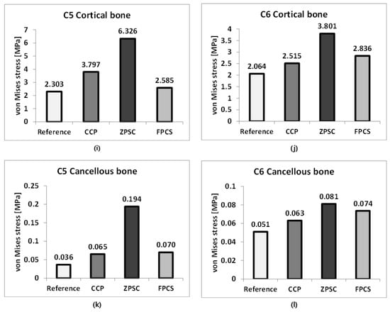 At C5 cortical bone, the von Mises stress increased from 2.303 MPa in the reference model to 3.797 MPa (164.87%) in the CCP model and 6.326 MPa (274.69%) in the ZPSC model. In contrast, the FPCS model showed a lower stress value of 2.585 MPa (112.23%) compared to the reference.