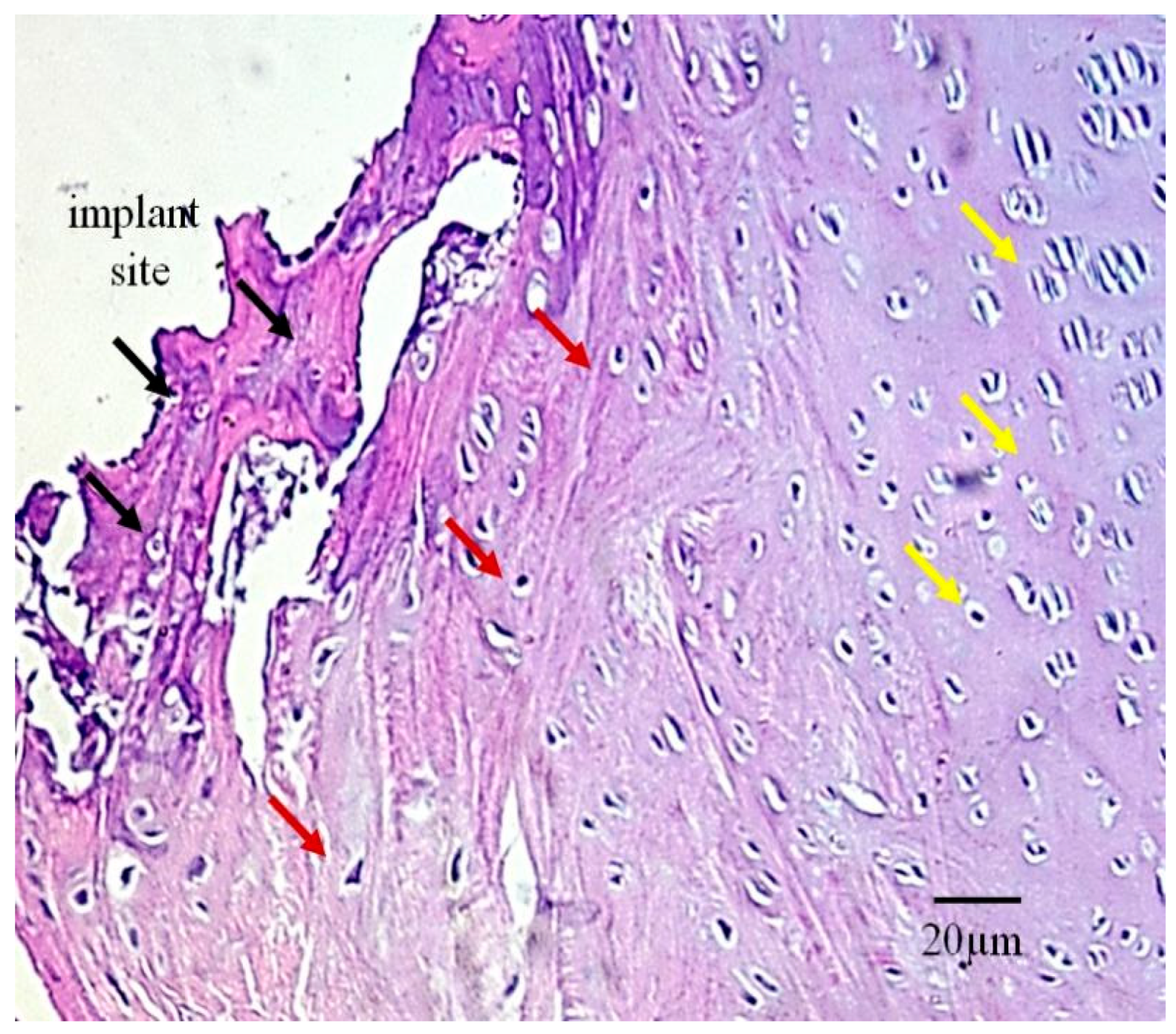 Figure 4, and they differ from one another in their organization and cytoarchitecture. Newly formed cartilage has extended between the defect surface and the implant, as it will later give rise to young bone. The spatial dynamics and progression of bone regeneration occur from the defect surface toward the implant. In the early phase, the young chondrocytes are irregularly shaped and thread-like, and lighter and darker purple regions of stained extracellular matrix can be observed around them (around the black arrows,