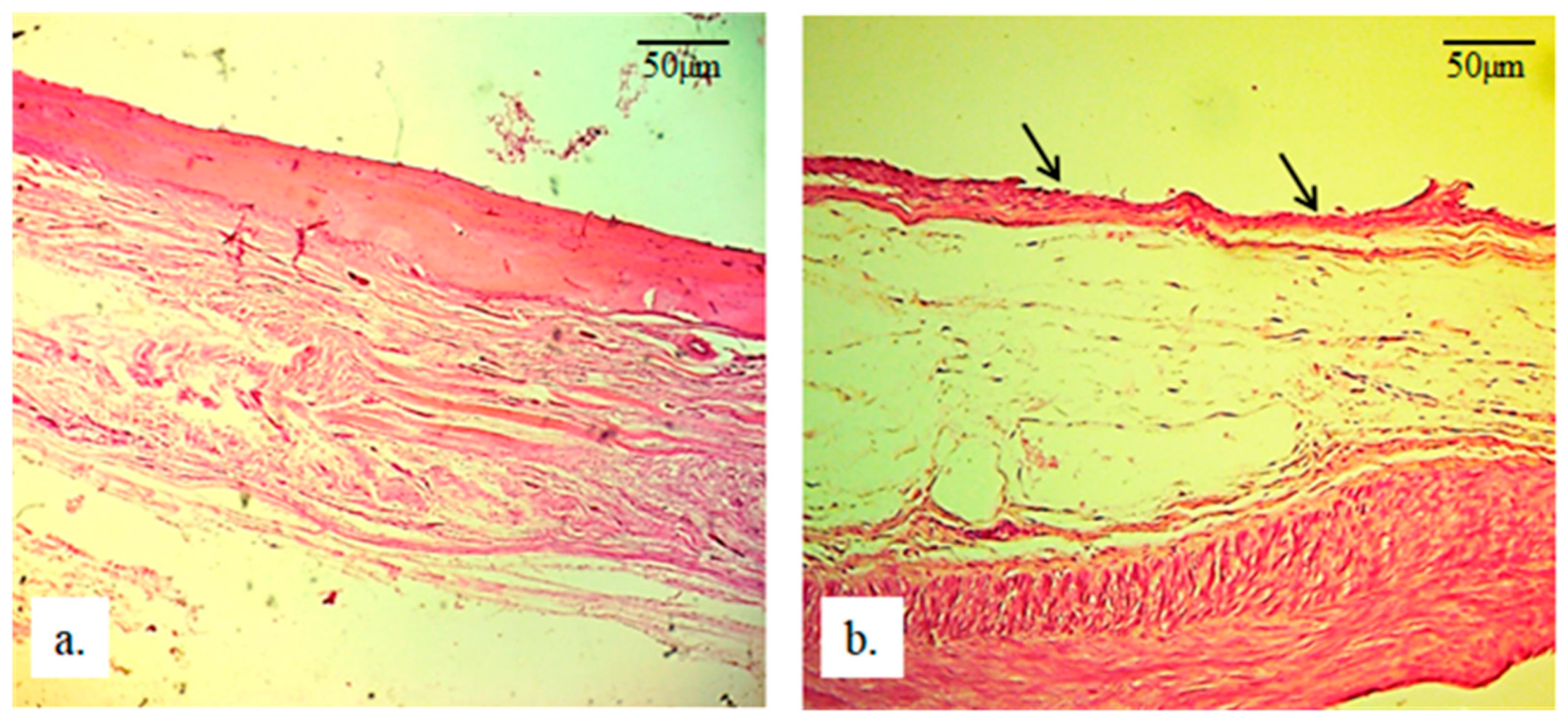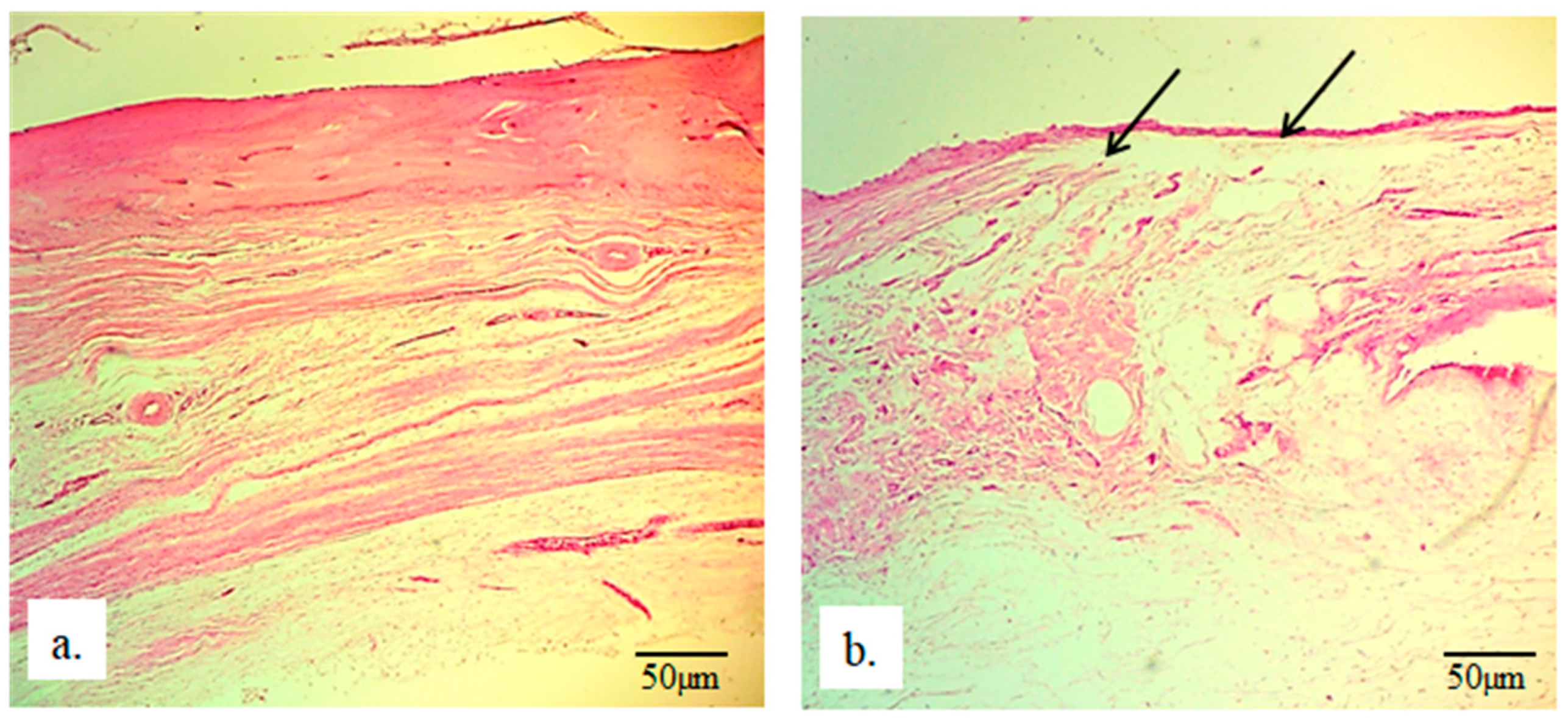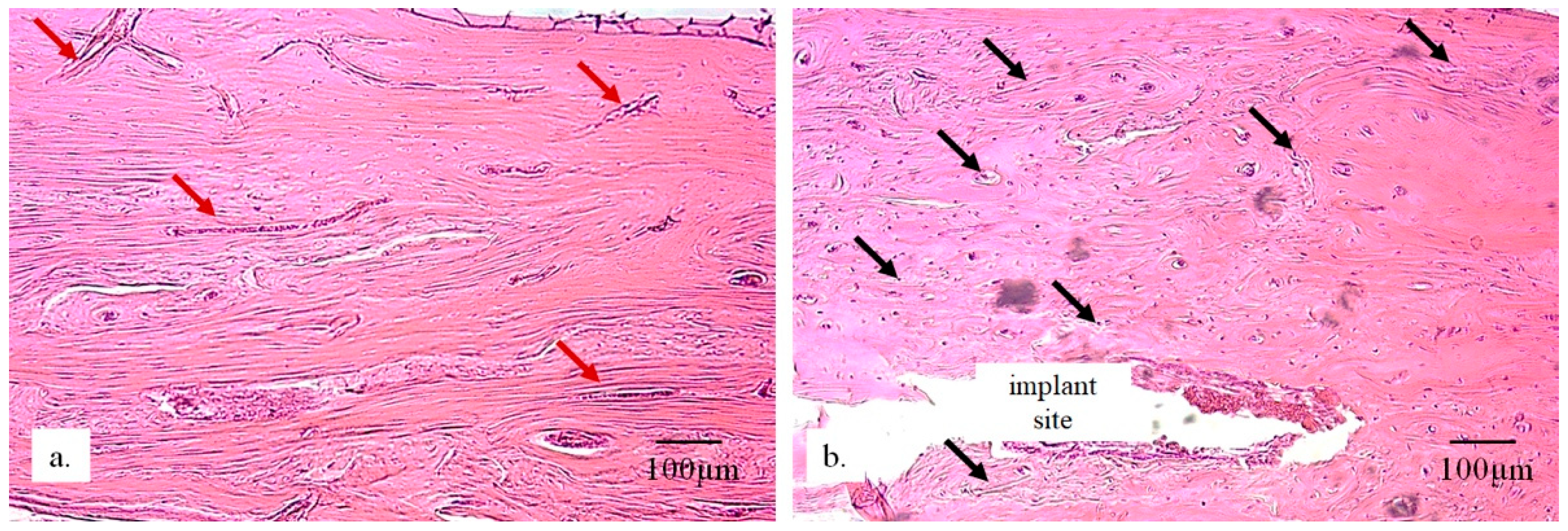 Figure 7b). The newly formed bone is extremely thin (black arrows), with young and numerous osteocytes. Additionally, in the bone tissue of the radius with the implant, no cysts, necroses, infiltration of any type of blood cells, or immune response cells are observed.
