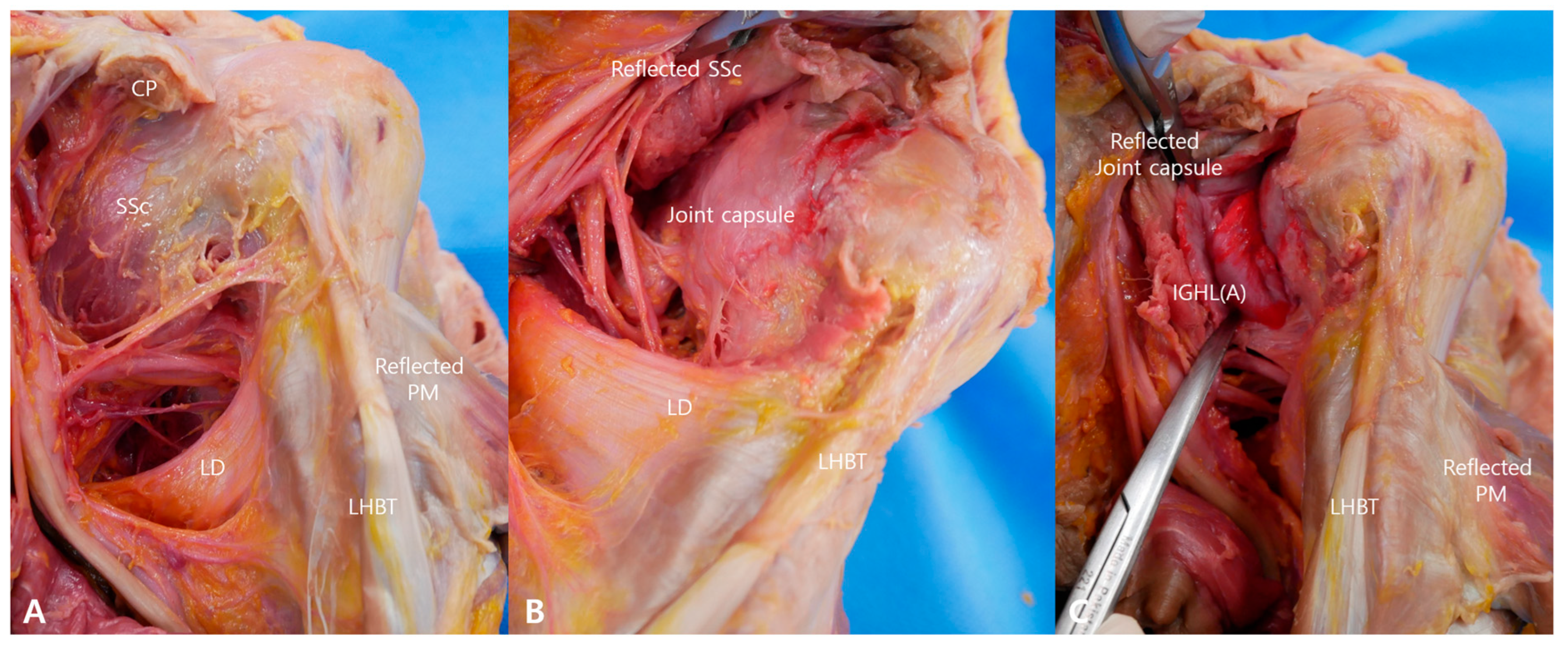 - Passanante, G.J.; Skalski, M.R.; Patel, D.B.; White, E.A.; Schein, A.J.; Gottsegen, C.J.; Matcuk, G.R. Inferior glenohumeral ligament (IGHL) complex: Anatomy, injuries, imaging features, and treatment options. Emerg. Radiol. 2017, 24, 65–71. [Google Scholar] [CrossRef]
