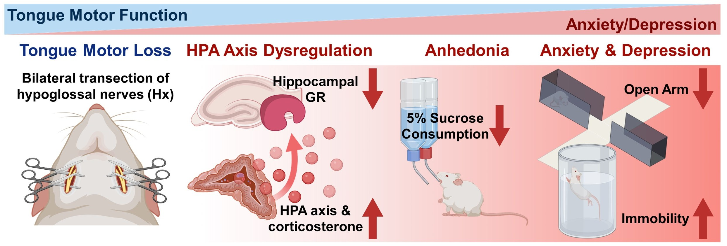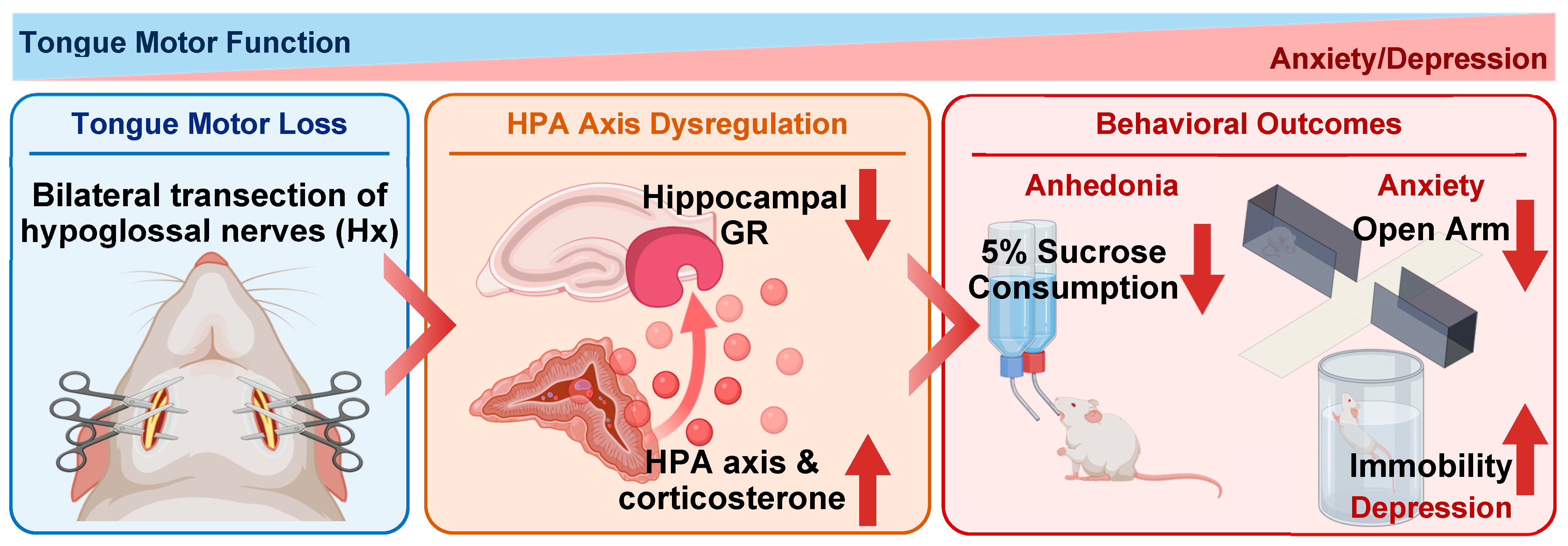 5]. Despite accumulating evidence linking oral function to hippocampal-dependent cognition, its role in affective regulation and neuroendocrine control remains less well understood. In particular, it is unclear whether disruption of oral motor function can influence emotional behaviors through stress-related neuroendocrine pathways such as the HPA axis. Addressing this gap may provide insight into how peripheral dysfunction in the oral system contributes to central mechanisms underlying anxiety and depression. Therefore, the present study aimed to investigate whether tongue motor loss induced by Hx leads to anxiety- and depression-like behaviors and to examine the associated neuroendocrine mechanisms.