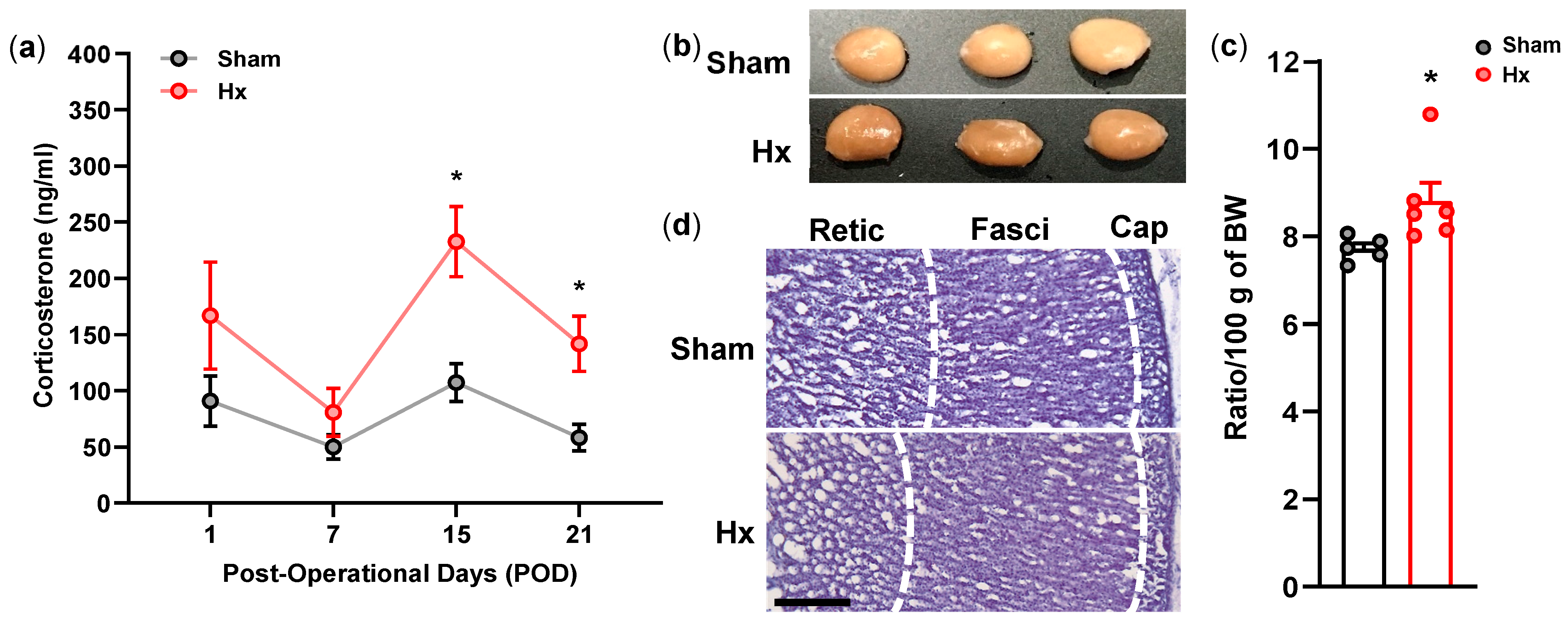 At POD15, animals were deeply anesthetized with 65 mg/kg sodium pentobarbital and subjected to transcardial perfusion using heparinized phosphate-buffered saline, followed by fixation with ice-cold 4% paraformaldehyde in 1X PBS. Adrenal glands were collected, weighed, and post-fixed for 2 h, then cryoprotected in 30% sucrose for 24 h. Tissue sections were prepared using a cryostat and stained with hematoxylin and eosin following standard procedures.