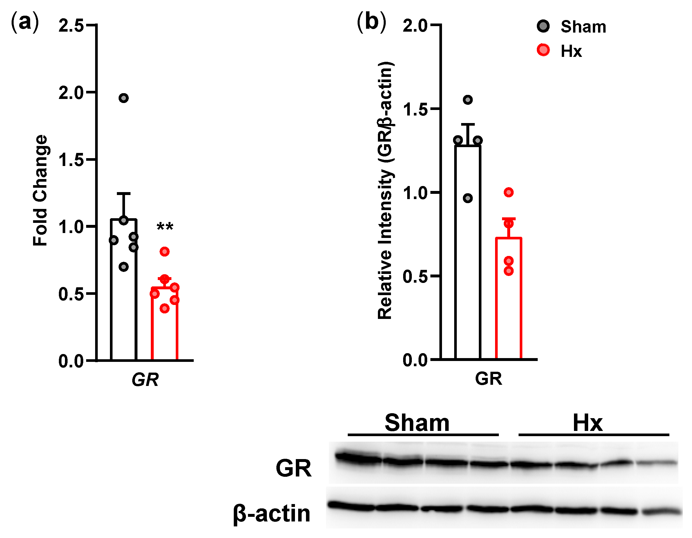 Hippocampal samples were collected at POD14 and processed for protein analysis. Tissues were homogenized in extraction buffer containing protease and phosphatase inhibitors. Following centrifugation at 13,000 rpm for 20 min at 4 °C, supernatants were collected. 40 μg proteins were separated by SDS-PAGE and transferred onto PVDF membranes. Membranes were blocked with 4% skim milk for 1 h at room temperature (RT) and then incubated with primary antibodies against GR in the blocking solution overnight at 4 °C. Membranes were incubated with horseradish peroxidase (HRP)-conjugated secondary antibodies (PI-2000, Vector Laboratories, CA, USA) for 2 h at RT. Protein bands were detected using chemiluminescence and quantified using ImageJ (ver. 1.53k). GR expression levels were normalized to β-actin.