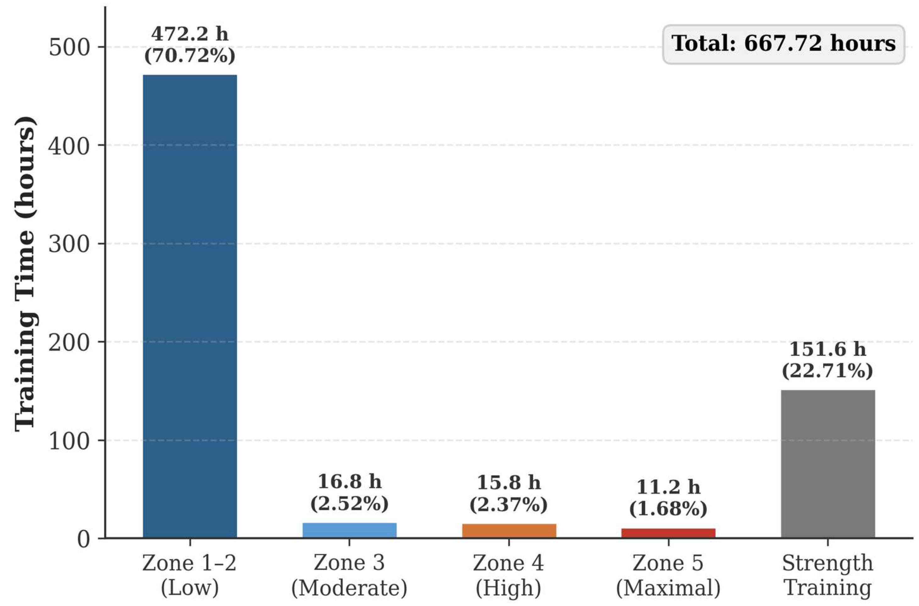 | Zones 1–2 (% of endurance only) | 91.5% | ~91% * |