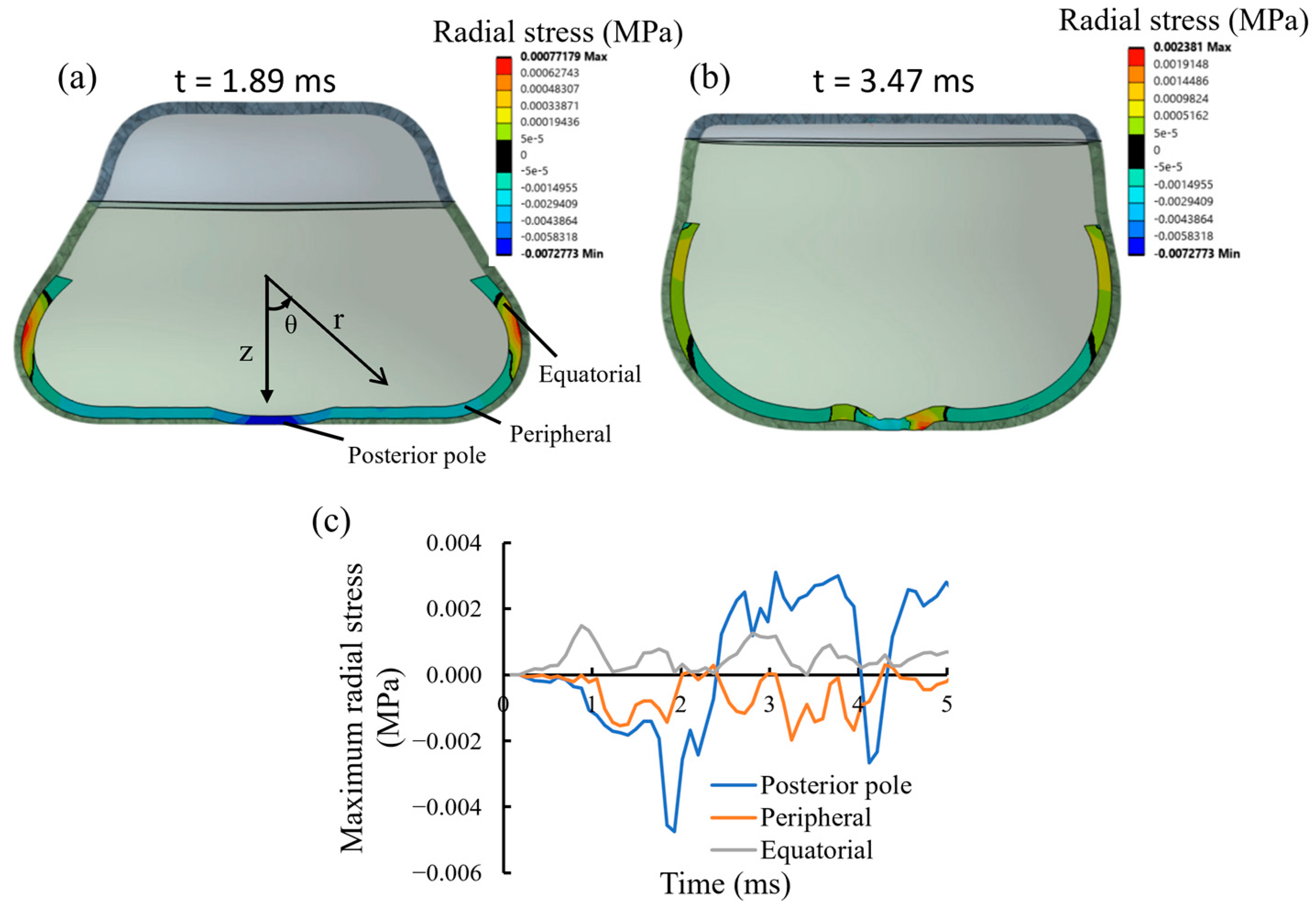 | Equatorial | Radial stress variation during impact and retraction | Detachment observed in pigment epithelium and photoreceptor layers. |