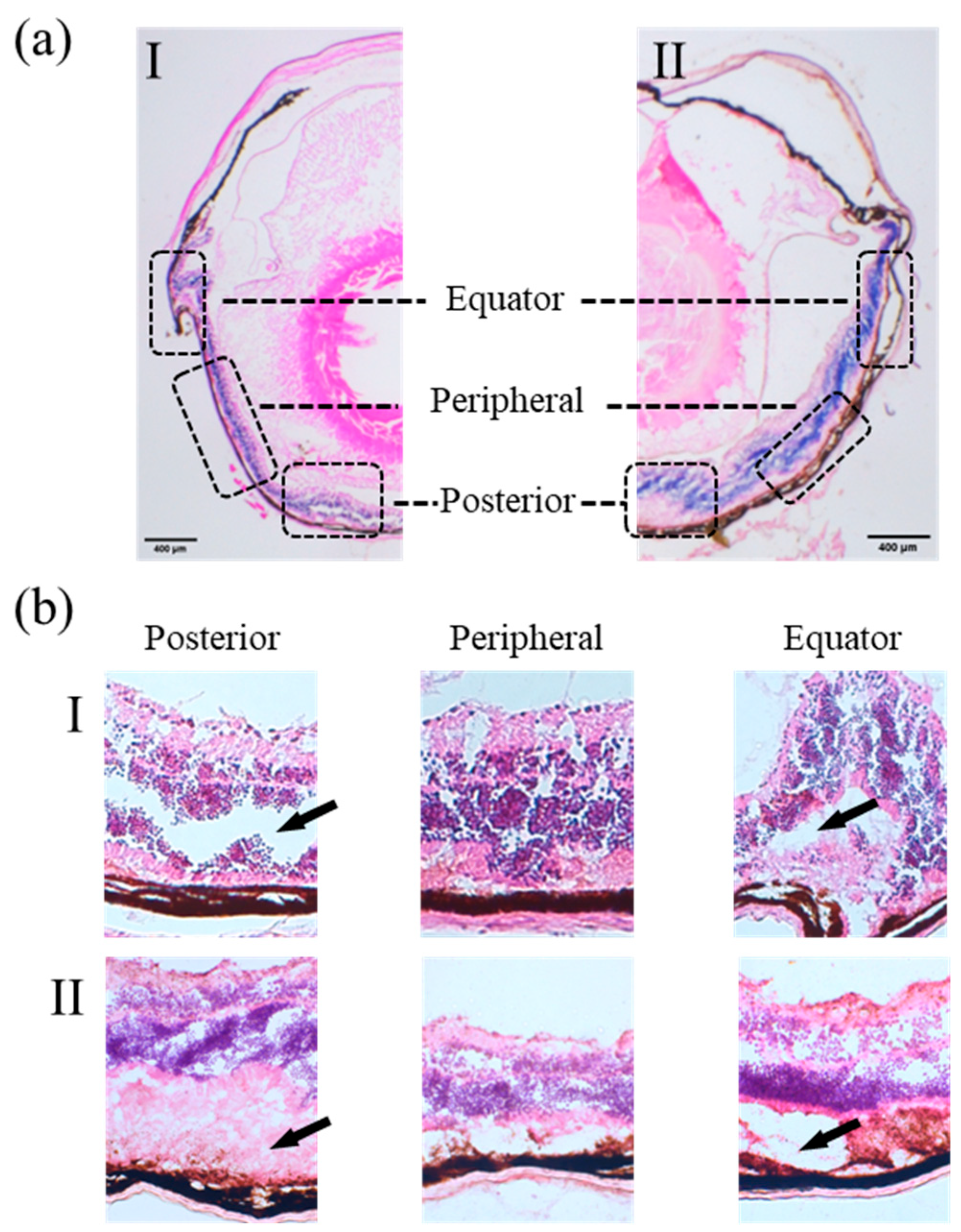 - Chen, D.; Liu, X.; Sun, X.; Liu, Y.; Geng, X.; Huo, H.; Tang, M.; Tang, Z.; Dong, Y.; Wang, J.; et al. Experimental Evidence to Understand Mechanical Causes of Retinal Detachment Following Blunt Trauma. Exp. Eye Res. 2023, 233, 109552. [Google Scholar] [CrossRef] [PubMed]