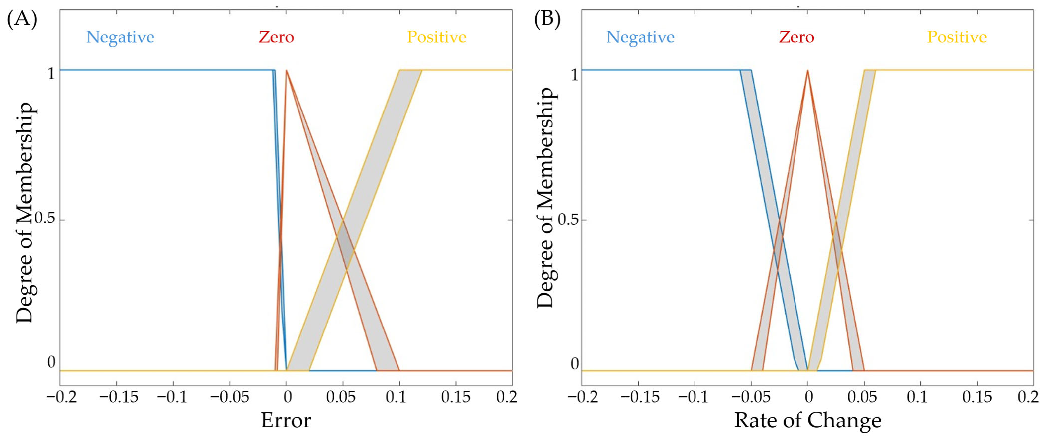 These two key parameters—the filtered error and its derivative—form a state space that serves as the input to the fuzzy logic controller. Each input is represented using three membership functions that encode the qualitative behavior of the system. For both error and rate of change, the membership functions consist of: