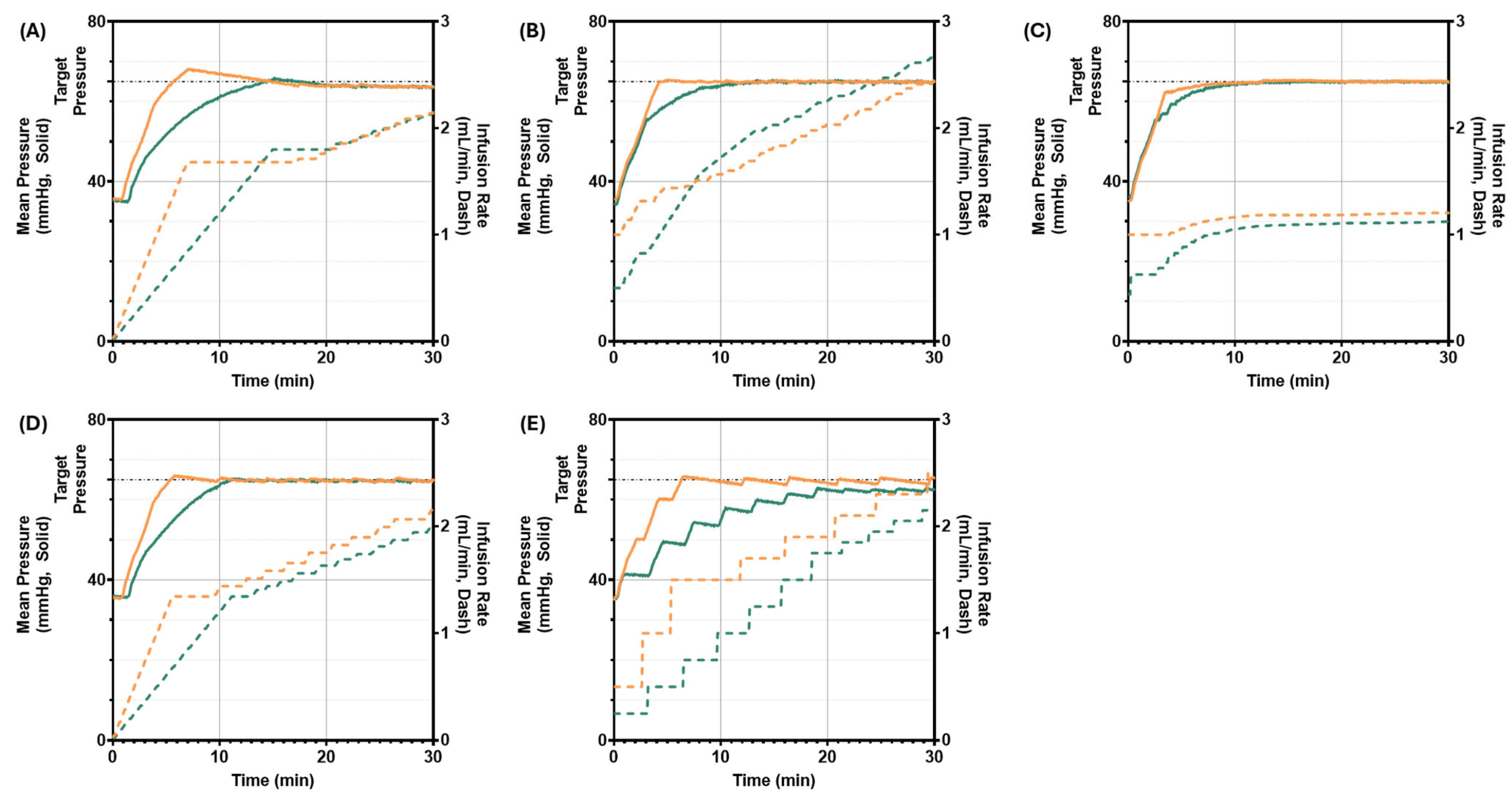 27]. Although these specific rise time targets are engineering design choices, their rationale was grounded in physiological considerations. Prior studies emphasize the dual need to restore arterial pressure promptly to avoid secondary organ injury, while simultaneously avoiding excessive vasoconstriction, masked hypovolemia, and ischemic complications associated with rapid or high-dose vasopressor administration. Clinical guidance commonly targets an MAP near 65 mmHg during damage control resuscitation, and highlights the risks of overly aggressive vasopressor use in hypovolemic states [