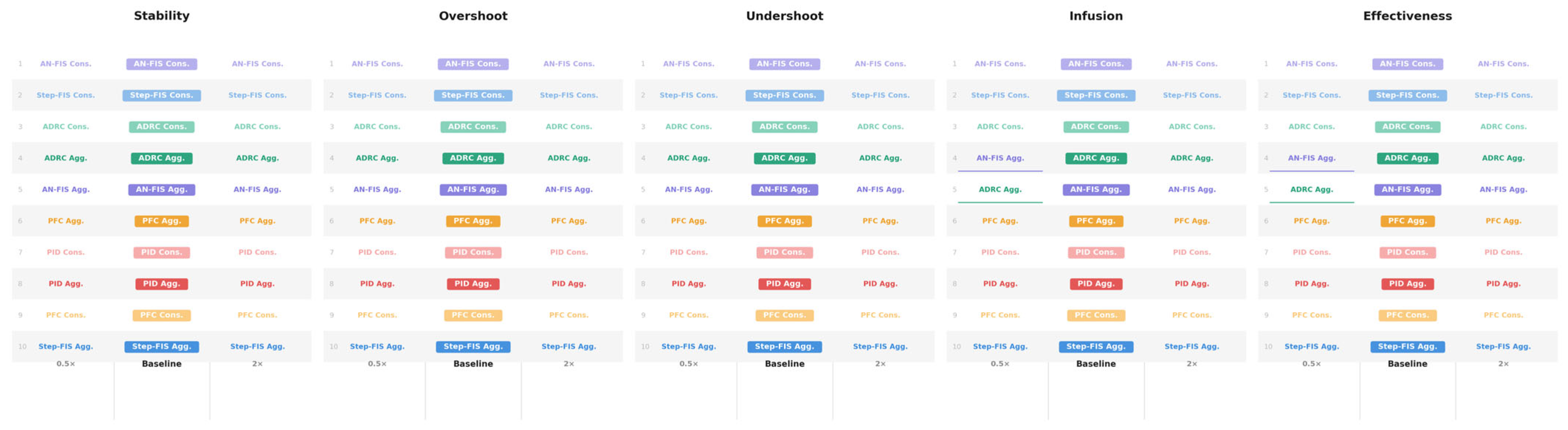 Table 3 and have been thoroughly described in the previous literature, except for Maximum Vasopressor Step Change, which was added to quantify the intensity of dosage change each controller used. Each metric was calculated separately across scenarios and controllers, but an aggregate score was calculated by merging metrics into equation terms (Equations (2)–(6)) based on five controller features: (i) stability, (ii) overshoot, (iii) undershoot, (iv) infusion, and (v) EEffectiveness metrics. The overall aggregate score equaled the sum of the stability, overshoot, undershoot, and infusion terms multiplied by the effectiveness term, where the lowest score indicated best performance as shown in Equation (7).