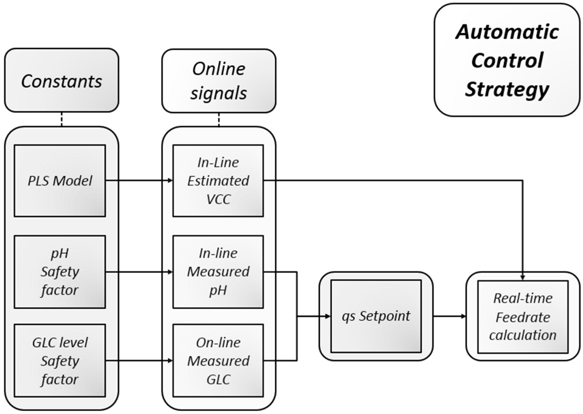 The recorded spectra were recorded every minute and directly translated into a real-time feed rate. The following script (Figure 1) controlled the process in the experiments. First, biomass was estimated using the coefficients calculated from a multivariate model. We used the assumption that glucose is limited and solely the feed rate is determining the volumetric glucose uptake rate. Both entities are combined to a specific glucose uptake rate, which is in turn used as a set-point to calculate a real-time feed rate. The calculation of specific substrate consumption qs was done by dividing the volumetric rate by the viable cell concentration. As derivative rates tend to be noisy, all specific rates were treated using Matlab’s rlowess function [55]. The set-point of the feeding rate was corrected in real time by either of two factors: by an online enzymatic analyzer result (such as threshold glucose concentration), or by pH (for instance a pH upper or lower band), or a combination of both.