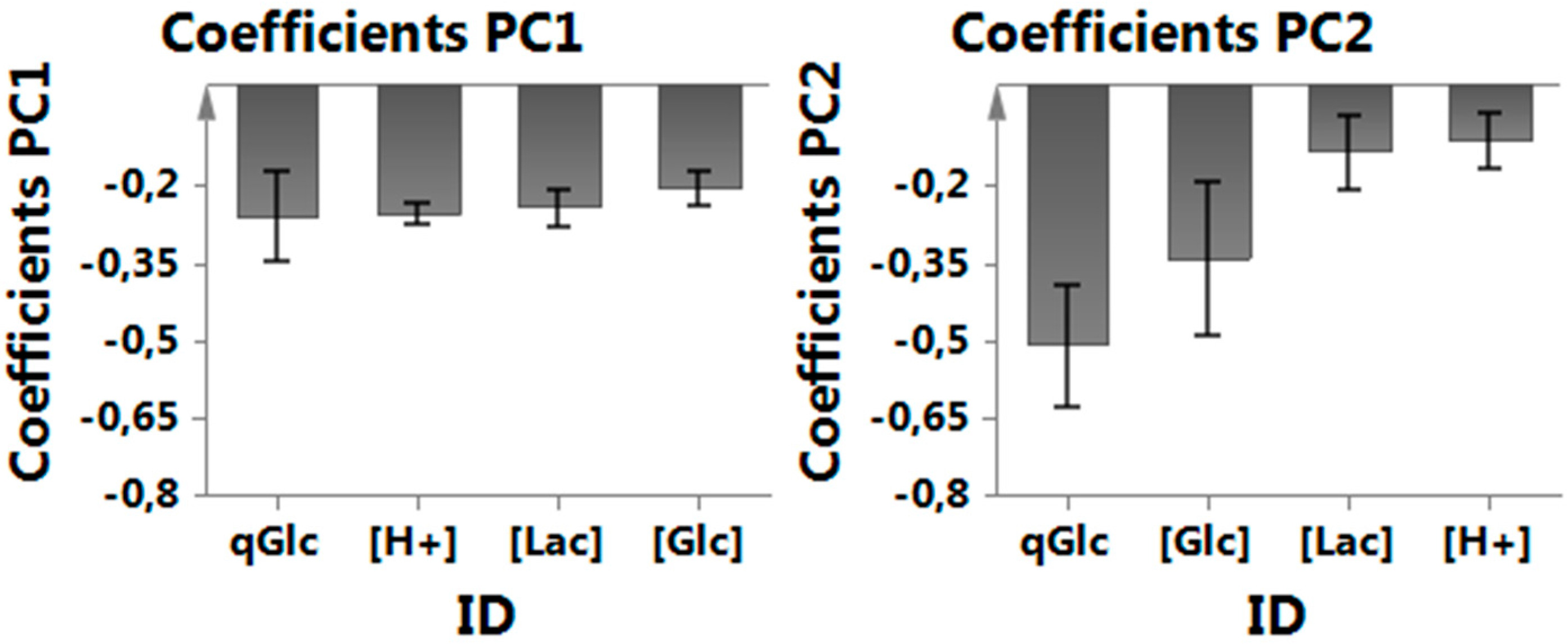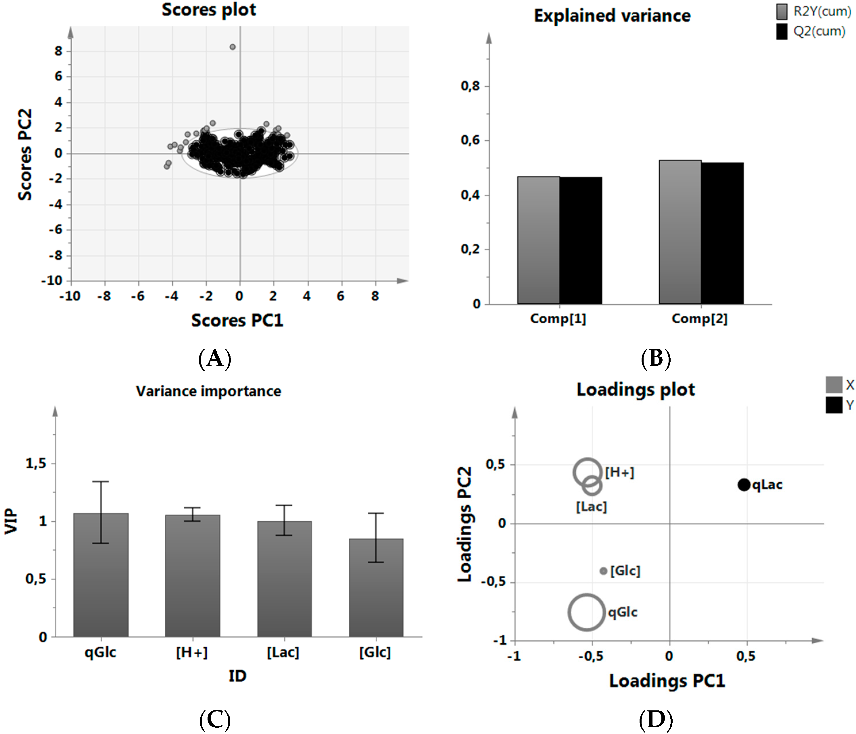 A VIP (variance importance of the projection) analysis was used to simplify the multivariate data analysis by calculating a relative score for those predictor variables, which were used to describe the predicted variable qLac. A high VIP score (Figure 2C) resulted in a larger size representation of the given parameter in Figure 2D. The positions of predicted variable qLac together with the predictor variables explained the overall relationship of all parameters; H+ and LAC were clustered closely to each other and indicate a closer relationship, while all parameters, including GLC and qGlc, were positioned opposite of qLac, indicating an inverse relationship (see the Appendix for more information on the importance of GLC in this analysis, in particular Figure A1 and Figure A2). As GLC had the lowest VIP score, its importance may be understood to be low in this data set.