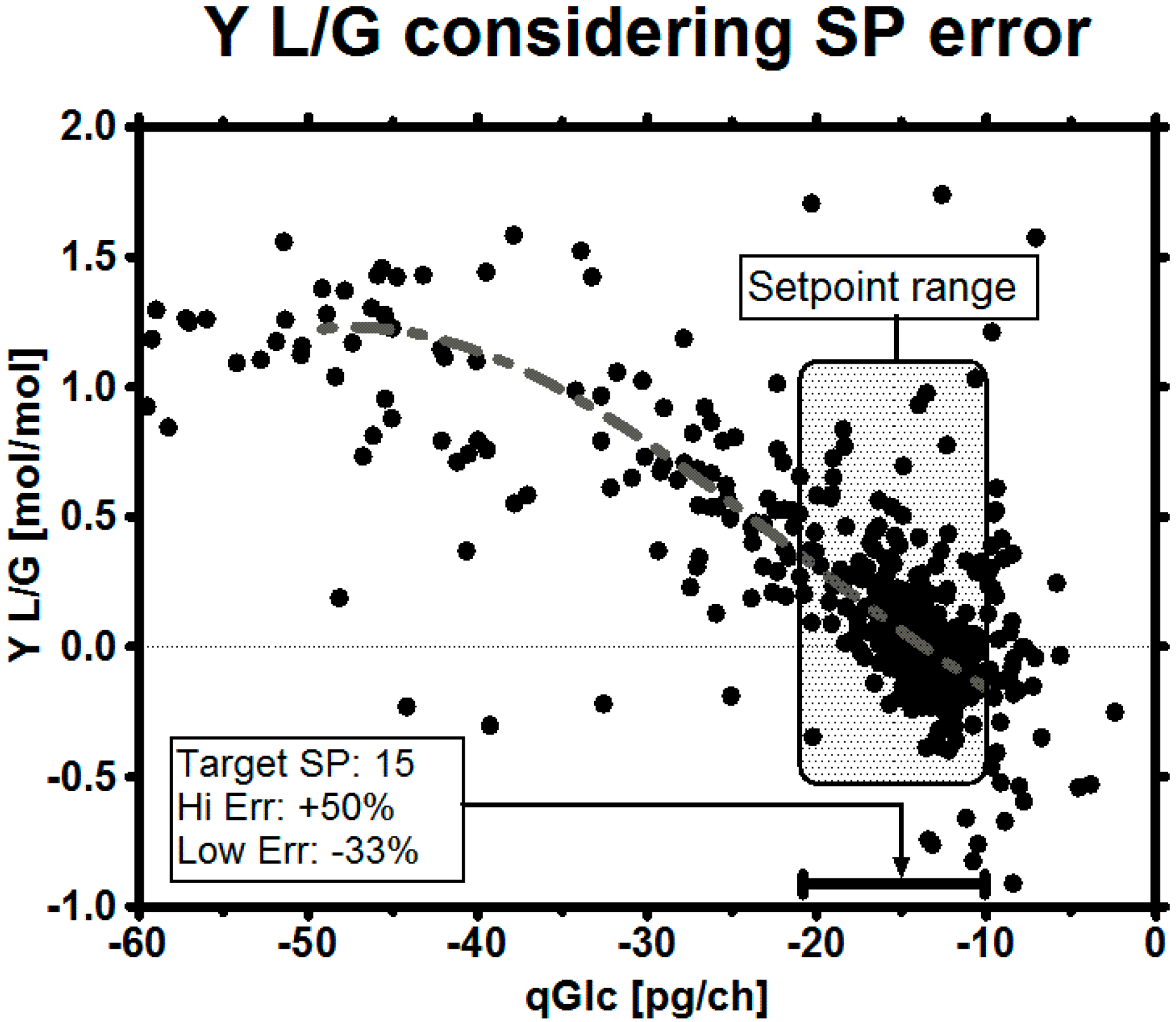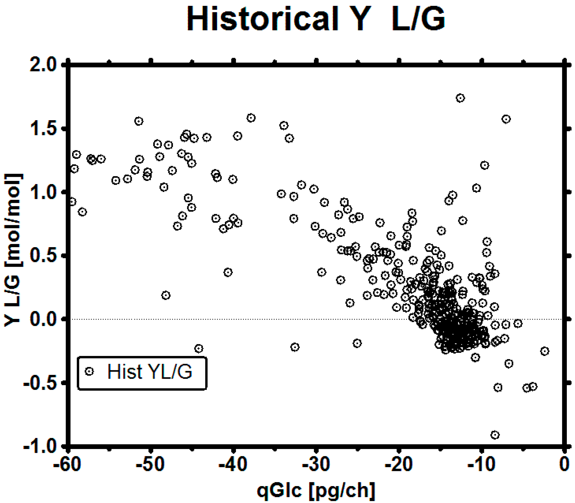 Historical yield qLac/qGlc (Y L/G) versus qGlc showing the consequence of particular qGlc on the yield.